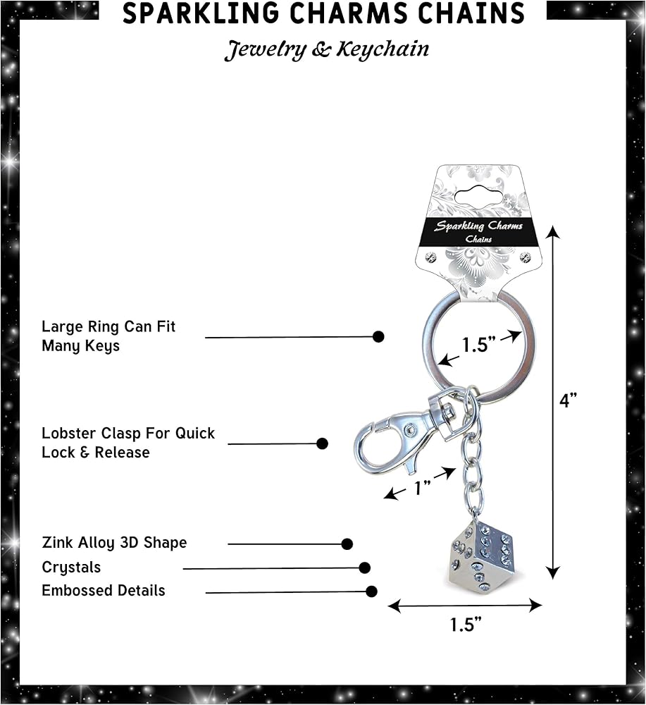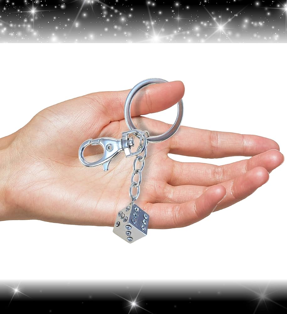 قم بتصميم حقيبتك ومفاتيحك وحقيبة الظهر أو استخدمها كهدية - تحدث عن متعة لامعة أينما ذهبت مع سلسلة المفاتيح الأنيقة هذه ذات سحر النرد الفضي. مشبك جراد البحر ذو اللون الفضي يجعل من السهل تثبيته بسلاسل المفاتيح وحقائب اليد وحقائب الظهر وحقائب اليد والسترات والحبال. السحر الفريد والمتألق على شكل نرد فريد ومغطى بكريستالات عالية الجودة لتوفير ديكور عصري. جعل حلقة المفاتيح هذه هدية مثالية لأي مناسبة: عيد ميلاد، ذكرى سنوية، عطلة، إلخ.