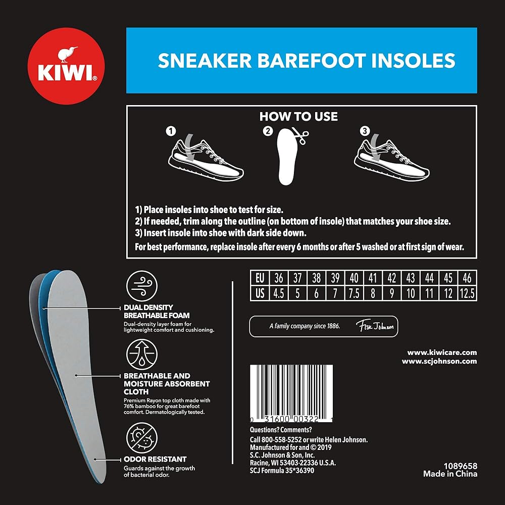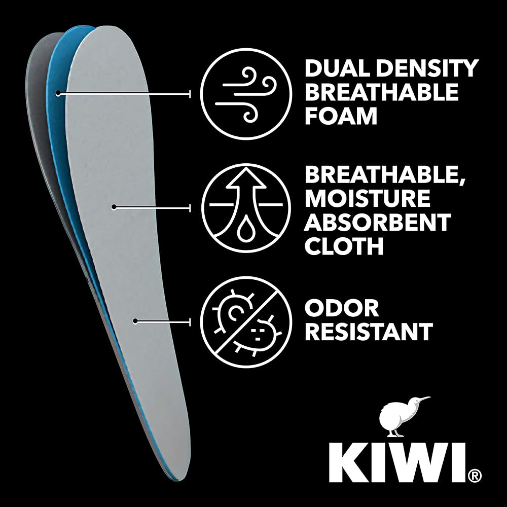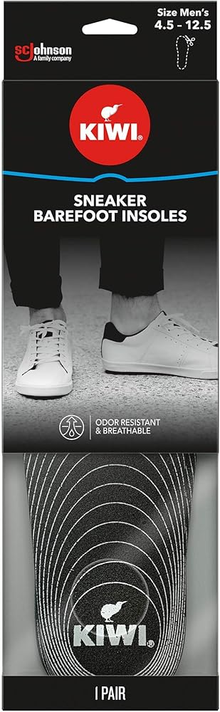 KIWI Sneaker Barefoot Insoles are breathable, moisture-absorbent comfort insoles that provide you with the freedom to wear your shoes comfortably and hygienically without socks. Each pack contains one pair of lightweight, dermatologically tested, washable shoe cushion inserts. KIWI Sneaker Barefoot Insoles are available in US men's size 4.5-12.5 / EU men's size 36-46. KIWI Sneaker Barefoot Insoles are not like conventional foam shoe inserts. They feature innovative technology, such as: - Odor Resistant - Guards against the growth of bacterial odor, which makes them preferable to leather shoe inserts. - Dual Density Breathable Foam - A dual-density layer of foam ensures that these shoe insoles provide lightweight comfort and cushioning. - Breathable and Moisture Absorbent Cloth - The premium Rayon top cloth, made with 76% bamboo, delivers superior barefoot comfort compared to conventional foam shoe inserts. They are also dermatologically tested, so you can be sure that they are appropriate for direct contact with skin.