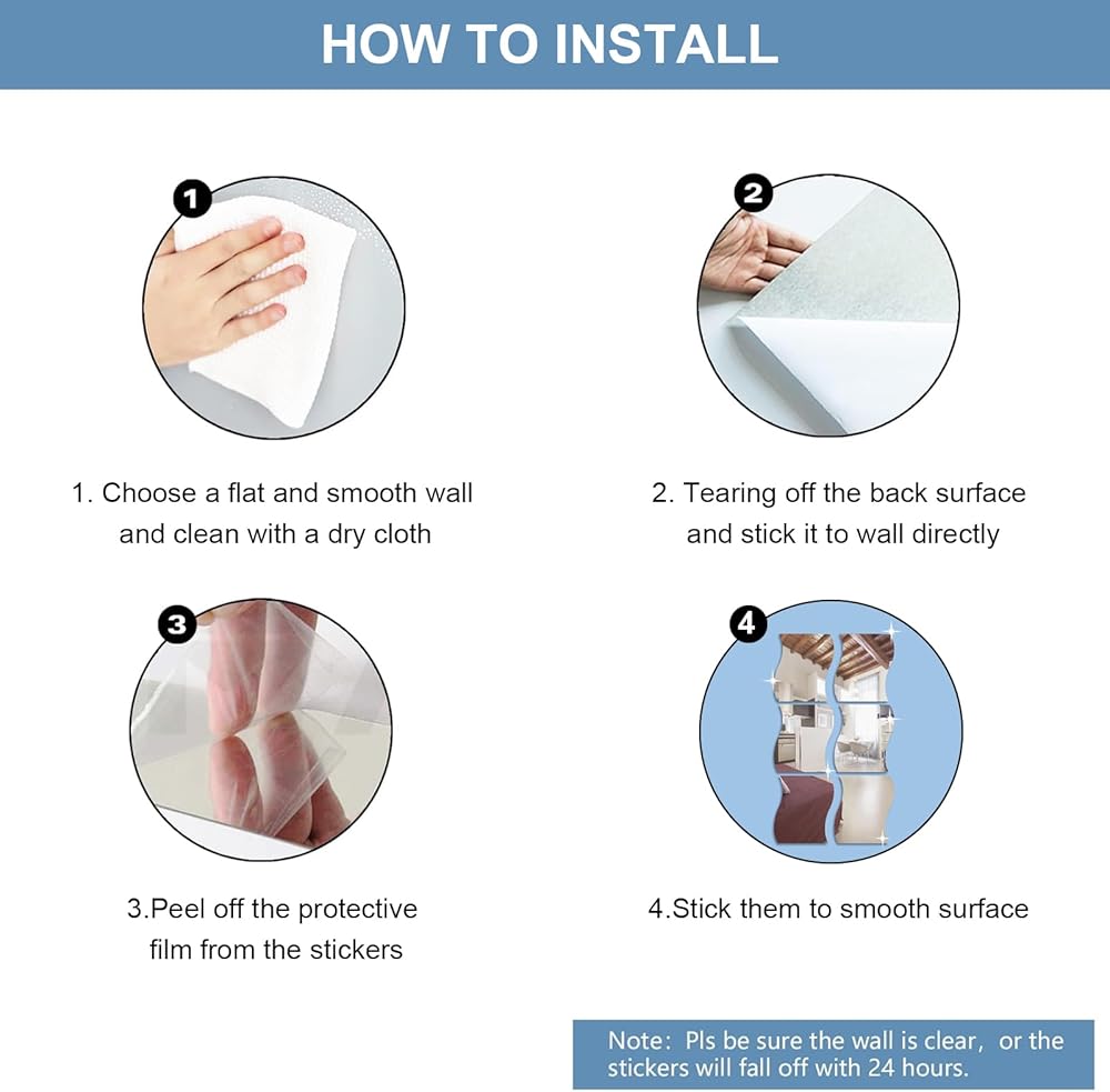 Easy to Paste and Removable: No need to measure, no cutting, just peel and paste. The back of wall sticker has double sided adhesive on it, just peel off white protective films, the wave mirror wall stickers can be fixed easily by its back-adhesive. It can removed without damaging your wall, if the position of the sticker is not satisfactory, reposition after disassembly.