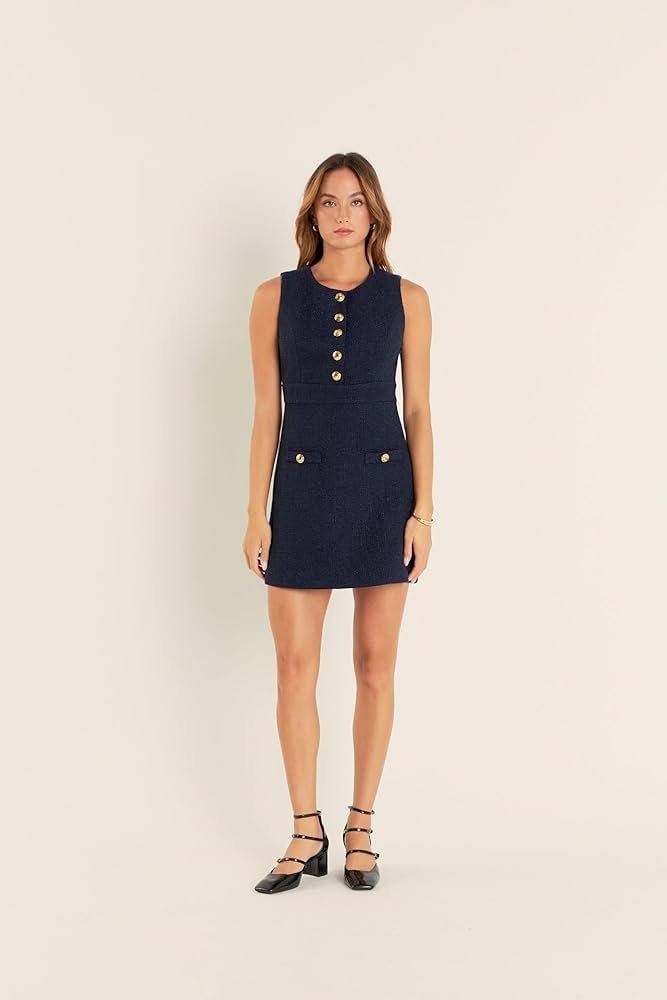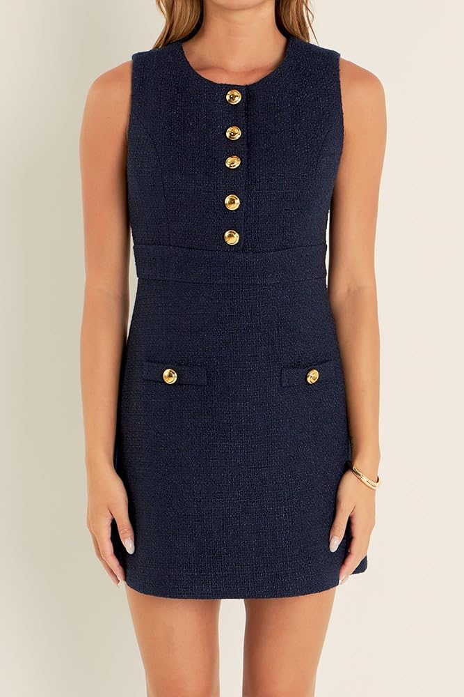 اكتشف المزيج الجذاب من الأنسجة في فستان التويد ذو الأزرار الذهبية للنساء من English Factory