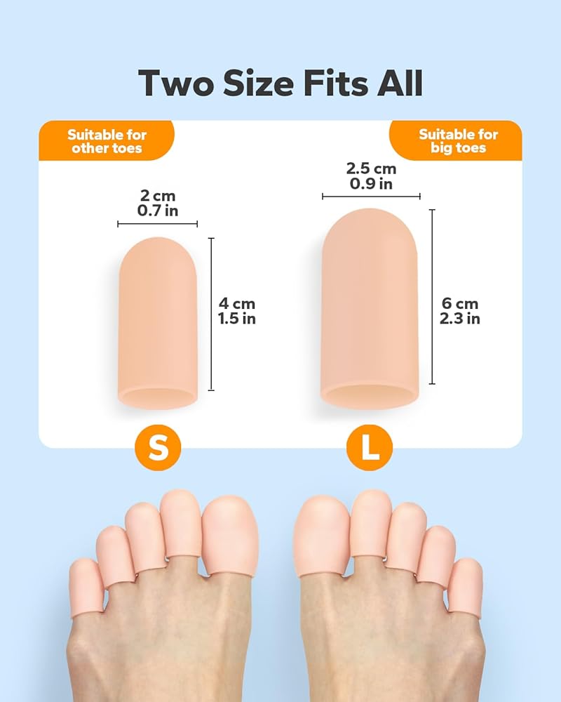 Set of 12 Toe Caps & Comfortable Toe Protection: We conveniently offer two sizes in one pack. 6 pack of Size Large, for the big toe and 6 pack of size small for other. This silicone toe protectors provide a cushioned barrier to prevent friction and irritation between toes, helping to alleviate discomfort from blisters, corns, and calluses.