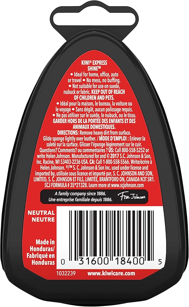 Express Shine Sponge - A brilliant shine in an instant. Features: Clear shine liquid for a fresh shine every time. Color in sponge provides a hint of color. No mess. No buffing. Directions: Remove heavy dirt from surface. Glide sponge lightly over leather.