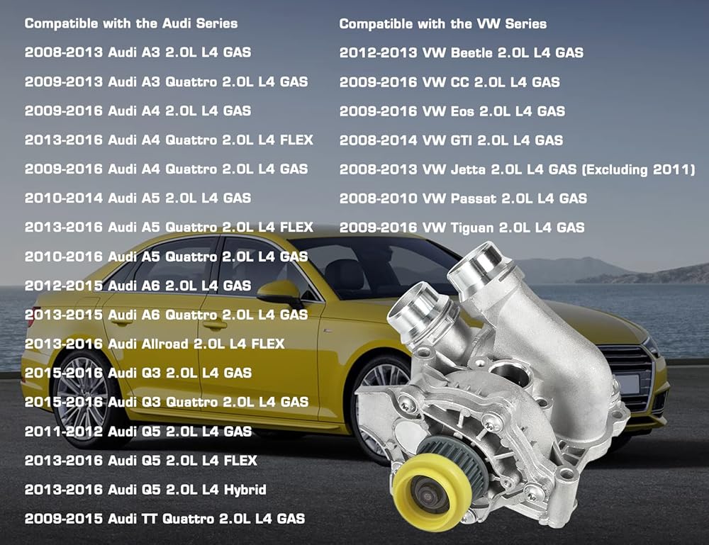 【الإعداد】مضخة مياه المحرك الكهربائي متوافقة مع A3 2008-2013، A4 2009-2016، A5 2010-2016، A6 2012-2015، Q3 2015-2016، Q5 2011-2016، TT 2009-2015. متوافق مع بيتل 2012-2013، CC 2010-2016، Eos 2012-2016، GTI 2008-2014، جيتا 2010-2013، باسات 2008-2010، Ti-guan 2009-2016. مزيد من التفاصيل يرجى اتباع الوصف.