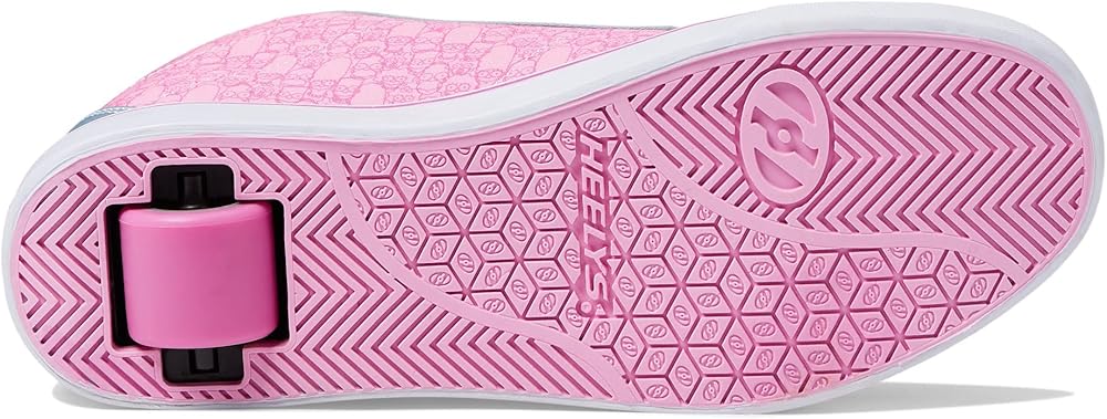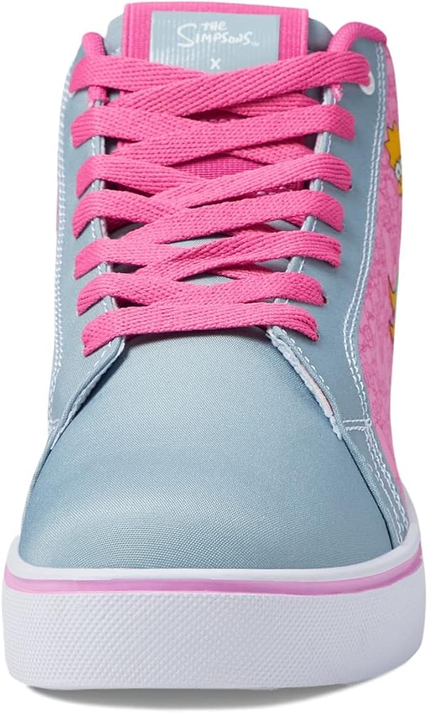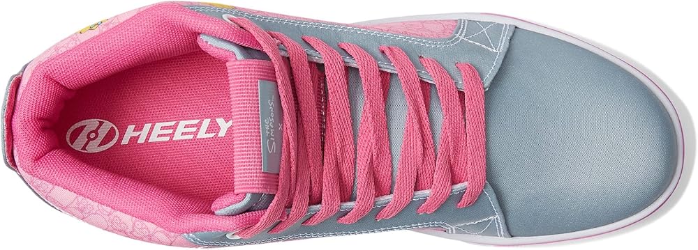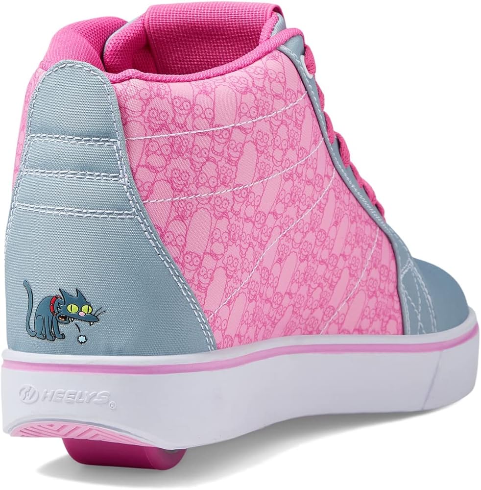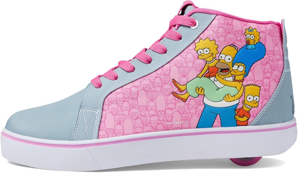Have fun rolling down the street in the Heelys Racer 20 Mid Simpsons classic sneakers with low-profile rollers. Textile and synthetic upper. Breathable textile lining and insole. Lace-up closure. Ankle-length shoes. Pull tab on the back. Cartoon print on the side upper. Padded collar and tongue. Low profile wheels with ABEC 5 bearings. Round toe silhouette. Synthetic outsole.