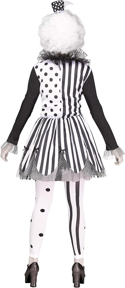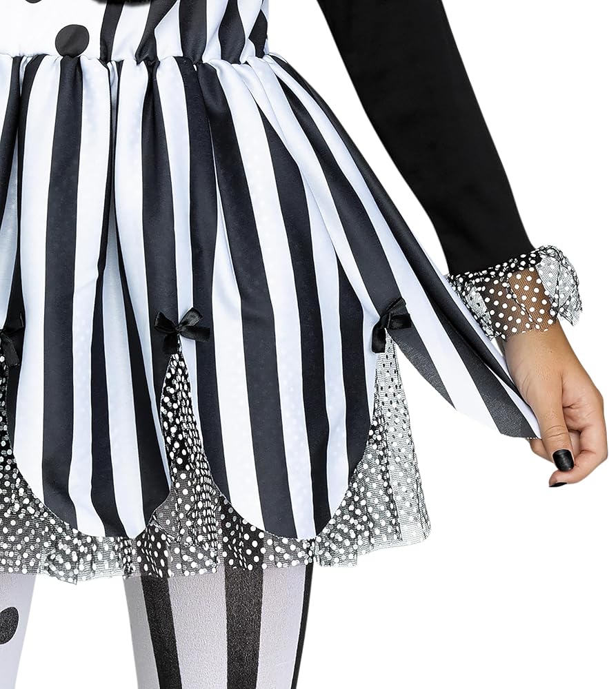 Transform into a terrifying character with the Women's Killer Clown Costume by Fun World. This sinister take on the classic clown features a black and white design with eerie tulle and mesh accents. Complete with matching tights and a headband hat, it's perfect for a creepy circus-inspired look. Whether you're going for full-on scary or a playful twist, this easy-to-wear costume will be a standout choice for Halloween.
