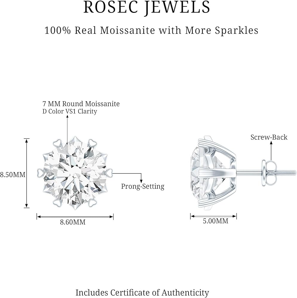 أقراط سوليتير مويسانيتي معتمدة من الفضة المطلية بالذهب، جودة D-Vs1، ترصيع مويسانيتي دائري 7 مم مع برغي خلفي