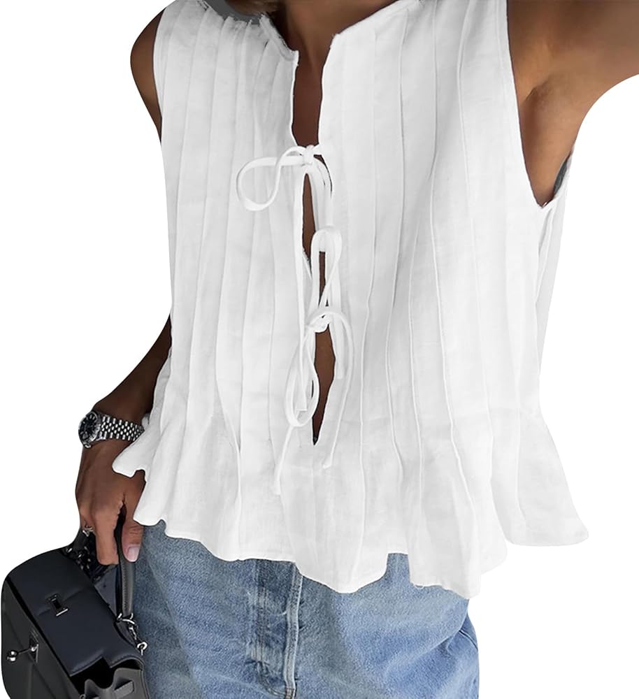 Women's Tie Front Tank Tops Solid Color Sleeveless Pleated Peplum Tops Size (cm) S Length: 46 Bust: 88 Shoulder: 31 M Length: 47 Bust: 92 Shoulder: 32 L Length: 48 Bust: 98 Shoulder: 33.5 Size (inch) S Length: 18.11 Bust: 34.65 Shoulder: 12.2 M Length: 18.5 Bust: 36.22 Shoulder: 12.6 L Length: 18.9 Bust: 38.58 Shoulder: 13.19
