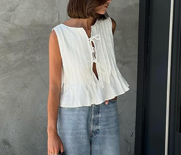 Design: Womens vest top features a charming bow tie front and delicate pleated ruffle details, give it a cute and feminine look.