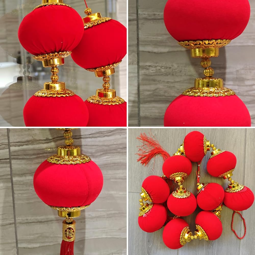 Traditional Lantern Design: Each lantern features a classic round shape adorned with intricate golden patterns; The iconic red lanterns are accented with gold trim, embodying the spirit of the Chinese New Year and enhancing your décor, symbolizing prosperity and happiness