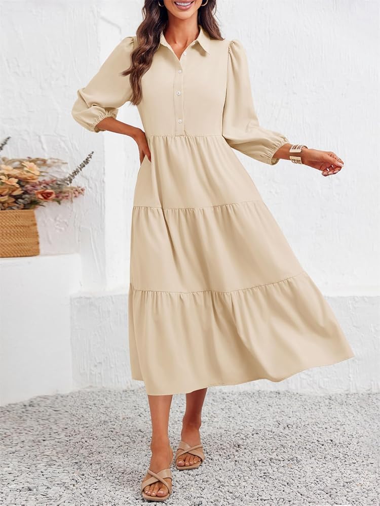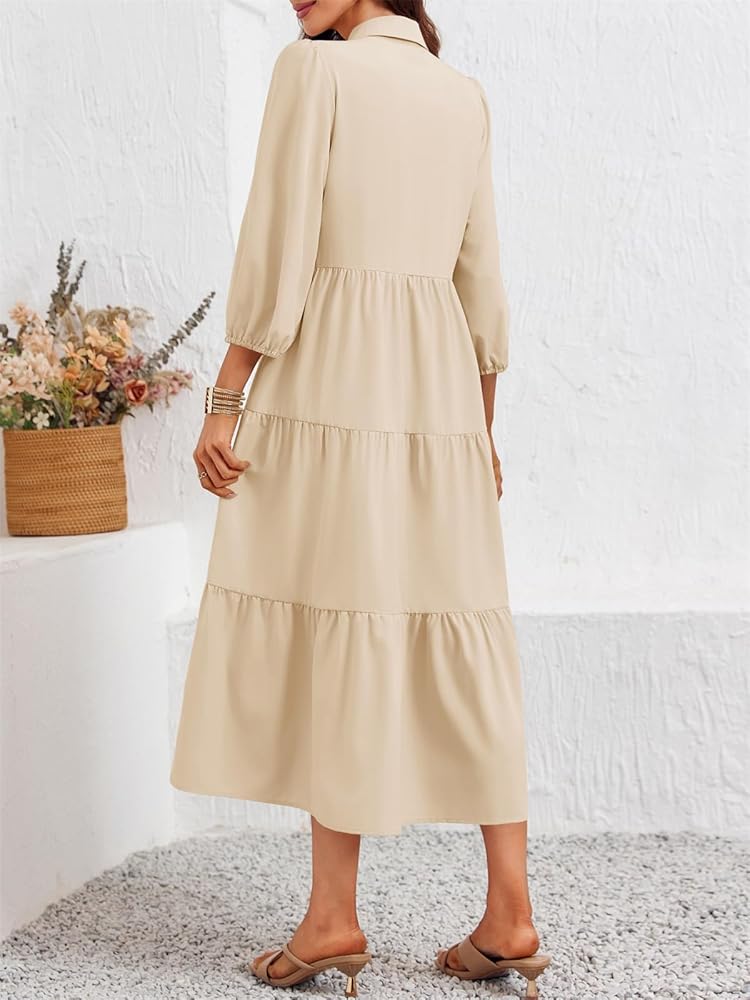 فستان Wenrine نسائي كاجوال بأزرار على شكل قميص ورقبة على شكل V 3/4 كم ذو ياقة متدرجة فستان ماكسي واسع باللون البيج