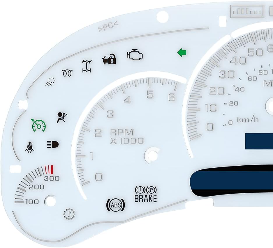 White Gauge Face Overlay LED Version Trans Temp Compatible with 03 05 GM Silverado Sierra Yukon Compatible with GM Silverado, Sierra, Tahoe, Yukon, Suburban, Denali, Escalade, Avalanche and H2 Hummers. (2003 2005) For Gasoline Engines ; Automatic Transmissions. White Gauge Face we selling suit for 2003 2005 GM Full Size Trucks and SUV's. These are for gas engines only and is just what you need if you are thinking of convert from KM to Miles or also adding the trans temp gauge to your existing instrument panel. The gauge face can be used for a 6 or 7 gauge cluster. The cover can be tackled with glue over the 7th gauge(trans temp) if you only need a 6 gauge cluster. This is LED version which has the numbers printed clear which allows LED's to shine through as color of LED you chosen. If you are planning to install LED's for different color scales in your cluster, this gauge face is your best choice. What we selling is only the gauge face, not the entire instrument cluster which just for show of application scene.