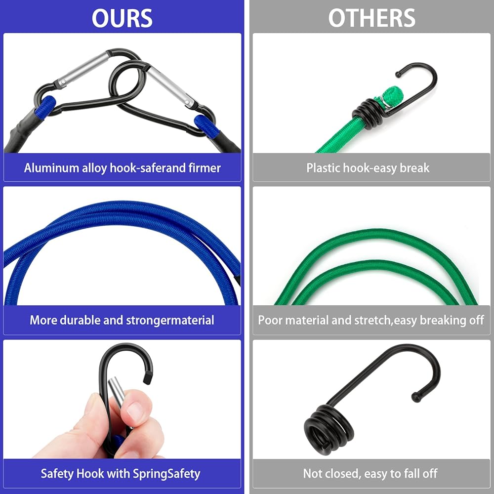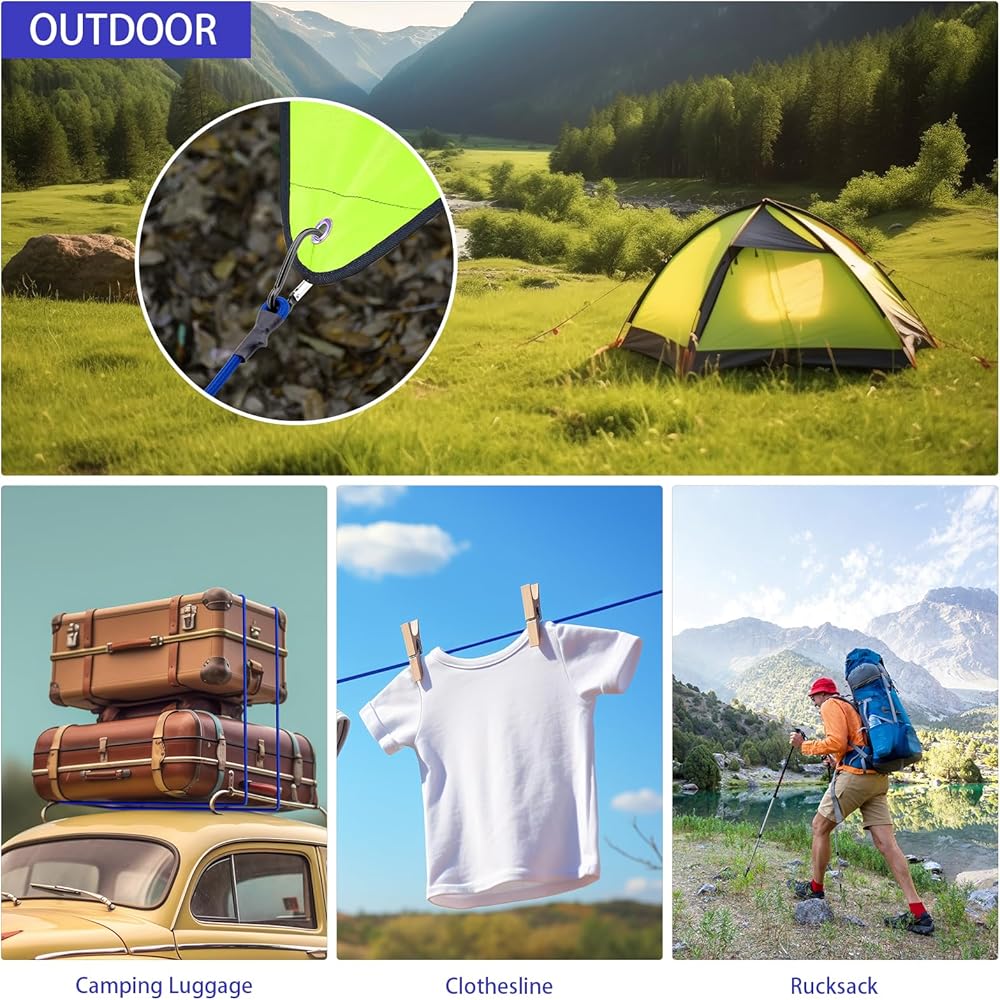 5. استخدامات متعددة: تستخدم الحبال المطاطية الخارجية على نطاق واسع للخيم الداخلية والخارجية والدراجات والغسيل والمقطورات والمركبات الترفيهية والدراجات النارية. تلبي الحبال المطاطية القصيرة المزودة بخطافات معظم احتياجاتك الآمنة من البضائع وهي أداة يجب اقتناؤها للاستخدام اليومي.