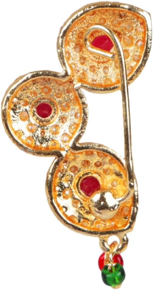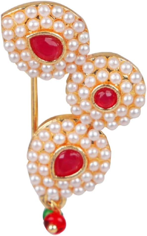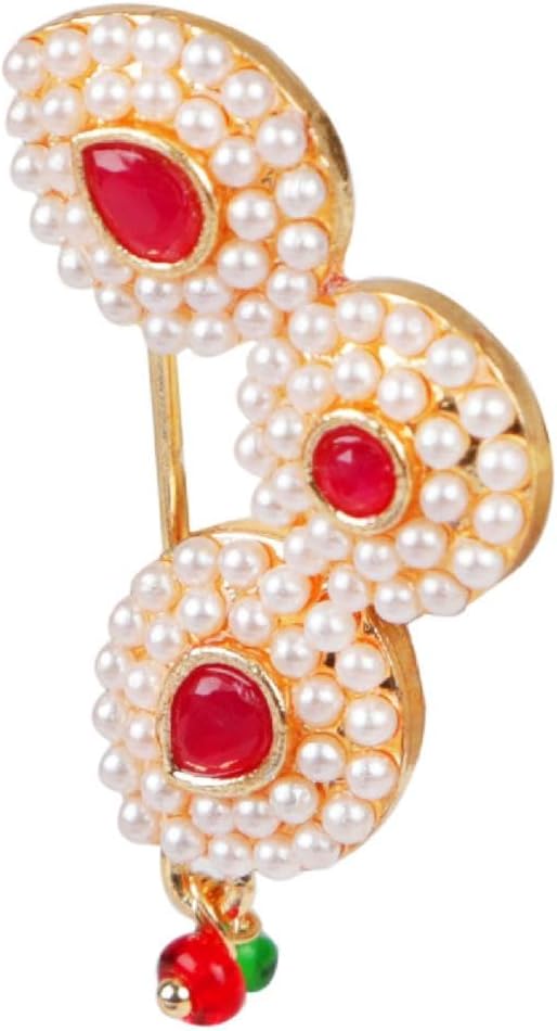This exquisite and elegant Indian bridal jewelry Maharashtrian style nath nathni clip on kundan crystal gold tone fake nose ring hoop nose pin stud nose ring fake nose septum statement jewelry costume accessories for women adds a contemporary cum trendy touch to your ensembles. This women's party wedding jewelry fake non piercing nose stud pin is embellished with kundan stone and faux peal drop, a classic fusion of exquisite craftsmanship and feminine elegance. This includes an insight of crude ethnic excellence for all type of traditional, trendy cum contemporary look. Perfect bridal nose jewelry accessories, wear this with your gorgeous traditional dress or wedding gown on any wedding, party, engagement, ring ceremony, anniversary or any festive or special occasion. Perfect Gift For Any Occasion! Ideal Valentine, Thanks giving, Mother's Day, Christmas, Anniversary gift. CARE INSTRUCTIONS: Avoid contact with heat, chemicals and water. Clean with dry cotton cloth. Pack in an air tight container/ pouch after use. It is advisable to wear the jewellery after makeup.