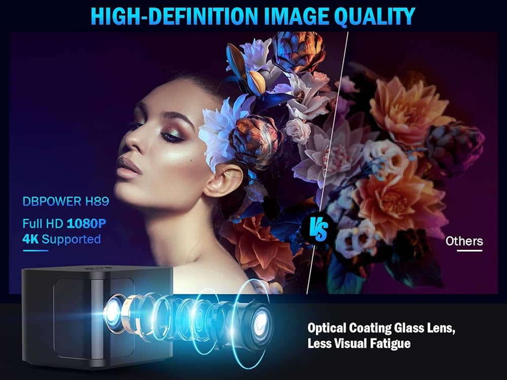 【جهاز عرض أفلام أصلي 1080 بيكسل اتش دي و12000 لتر】جهاز عرض أفلام خارجي DBPOWER H89 بدقة أصلية 1920*1080 بيكسل وسطوع 12000 لتر ونسبة تباين عالية 10000:1. تعمل العدسة المطلية بمؤشر الانكسار العالي المكونة من 6 طبقات على استعادة اللون الحقيقي للصورة، مما يوفر جودة صورة عالية الوضوح لتقليل تهيج العين. سواء كان المسرح المنزلي أو الأفلام الخارجية، والتي يمكن أن توفر لك تجربة بصرية أكثر راحة ونهائية.