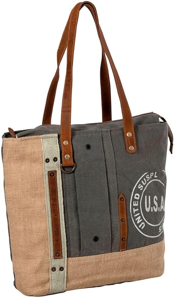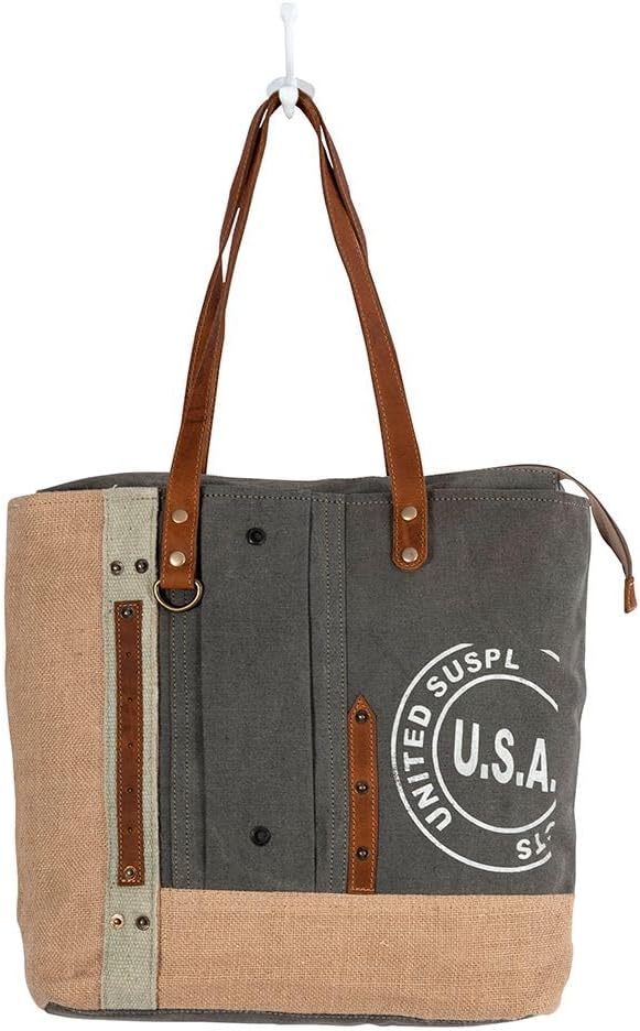 BEAUTIFUL TOTE BAG - This striking bag's patchwork design and “USA” seal set it apart. Its panels of differently colored woven canvas are accented with fine leather.