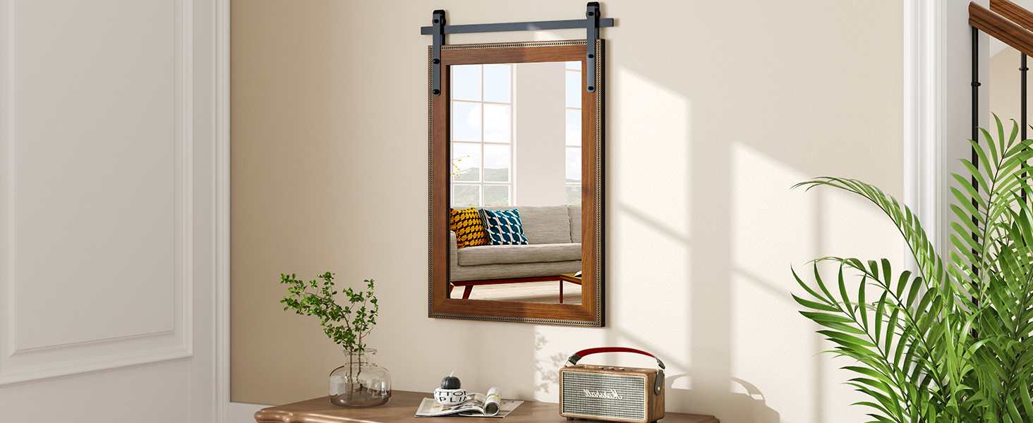 • 【ديكور متعدد الاستخدامات】 مرآة باب الحظيرة هذه ليست مجرد مرآة؛ إنه عمل فني زخرفي. يمكنك تعليقها في غرفة المعيشة أو غرفة النوم أو الحمام أو المدخل، مما يضيف على الفور سحرًا فريدًا إلى ديكور منزلك.