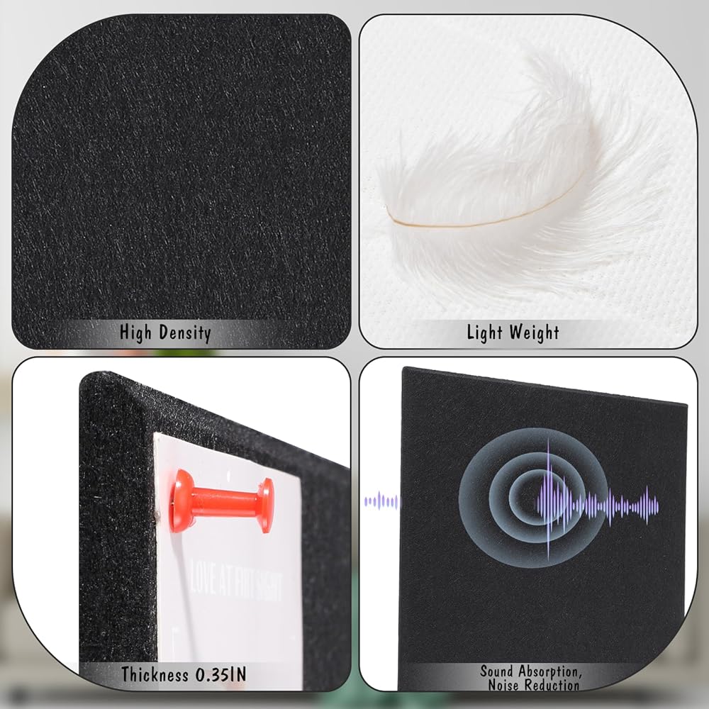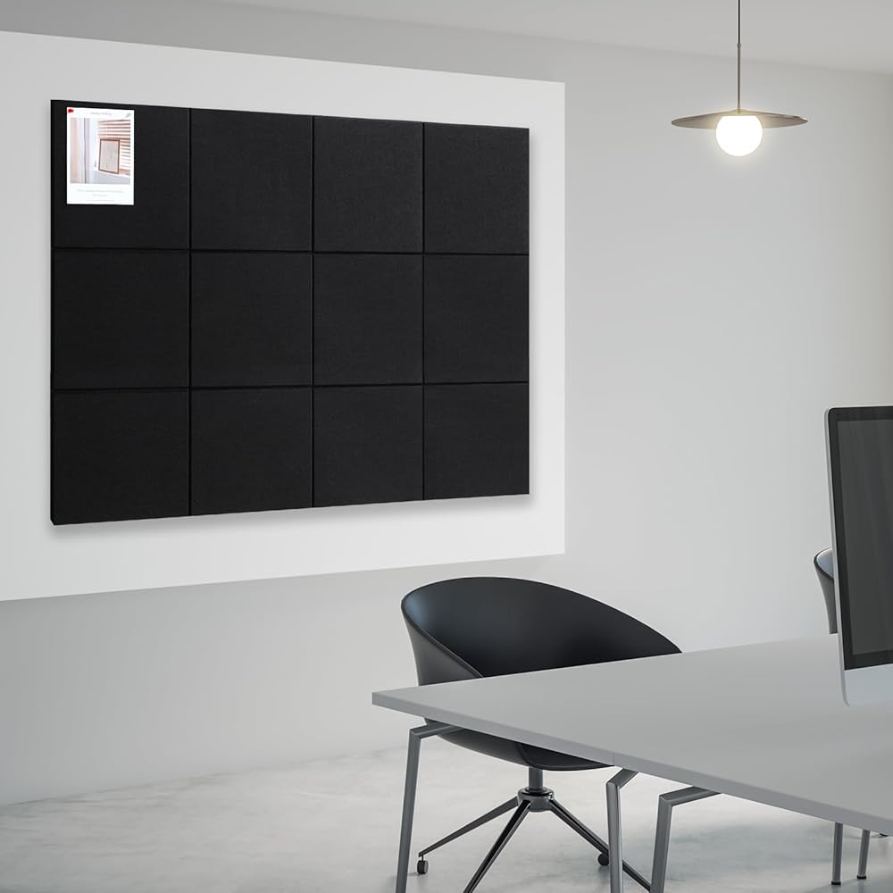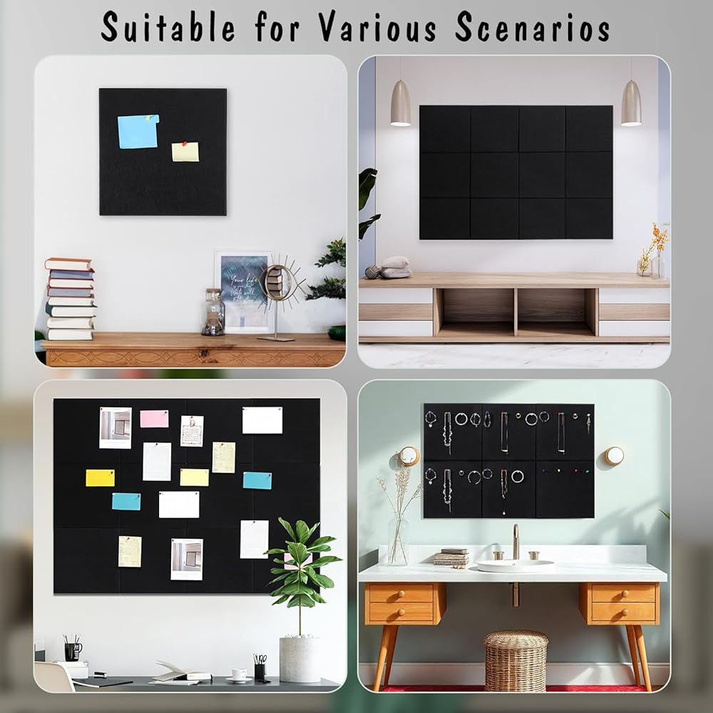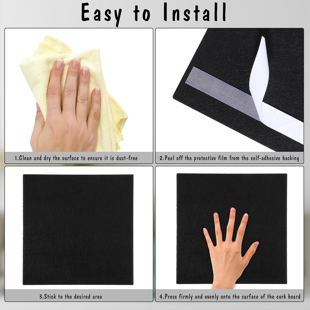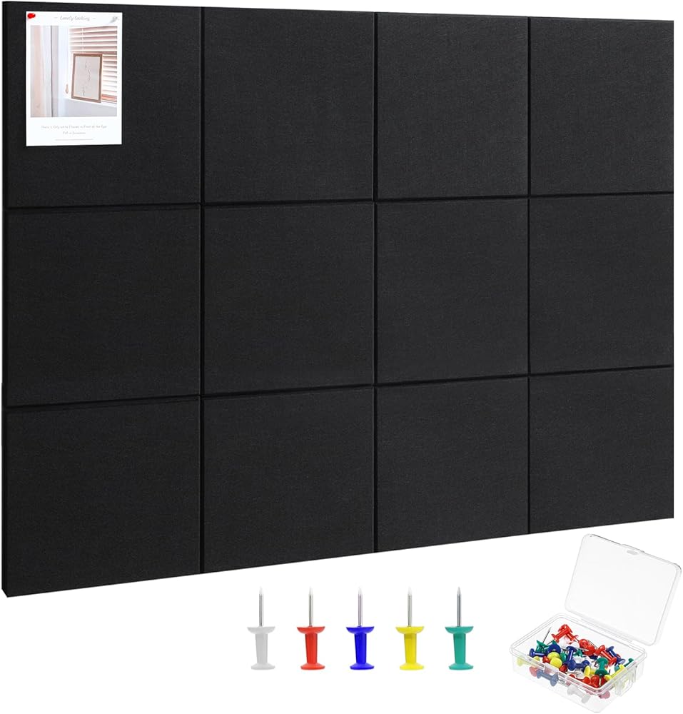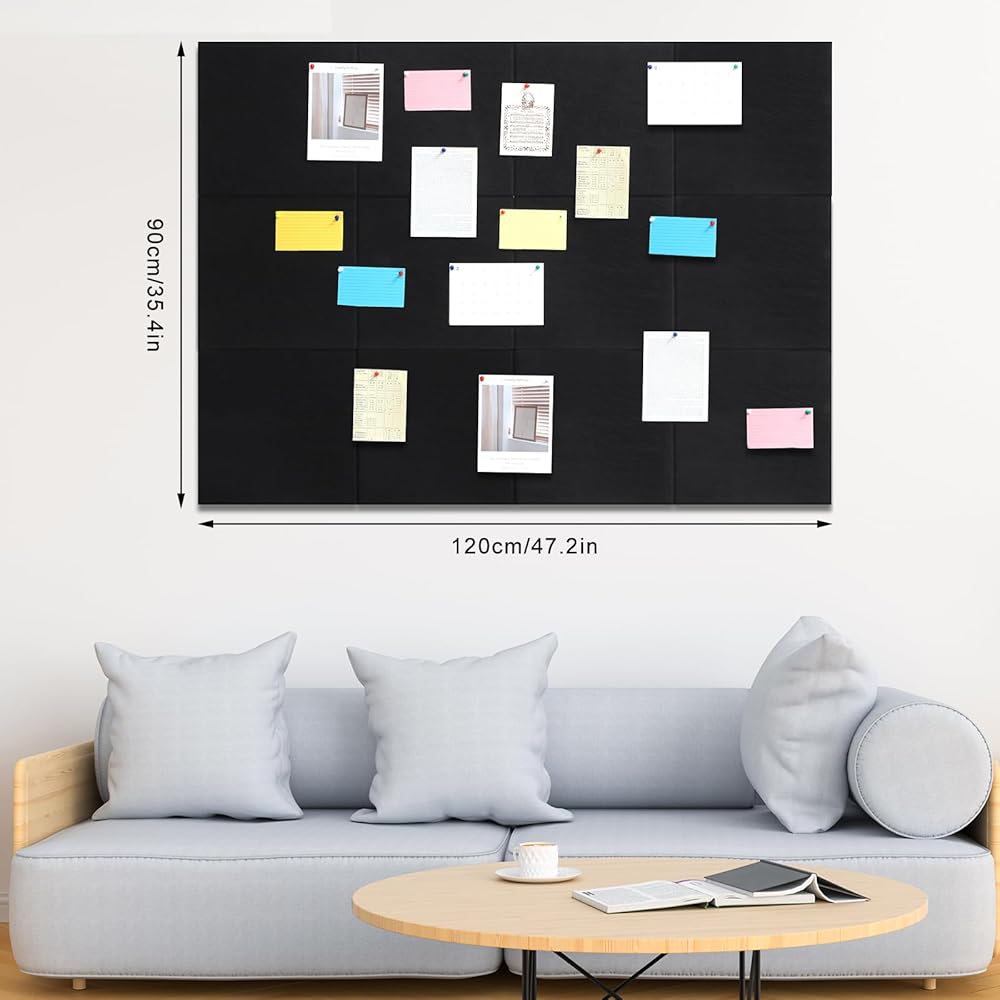 لوح فلين كبير مقاس 48 بوصة × 36 بوصة، 12 قطعة من بلاط الحائط اللباد مع دبابيس دفع ملونة، لوحة إعلانات مع شرائط ذاتية اللصق قابلة للإزالة، لوحات فلين لجدران المكتب والمنزل باللون الأسود