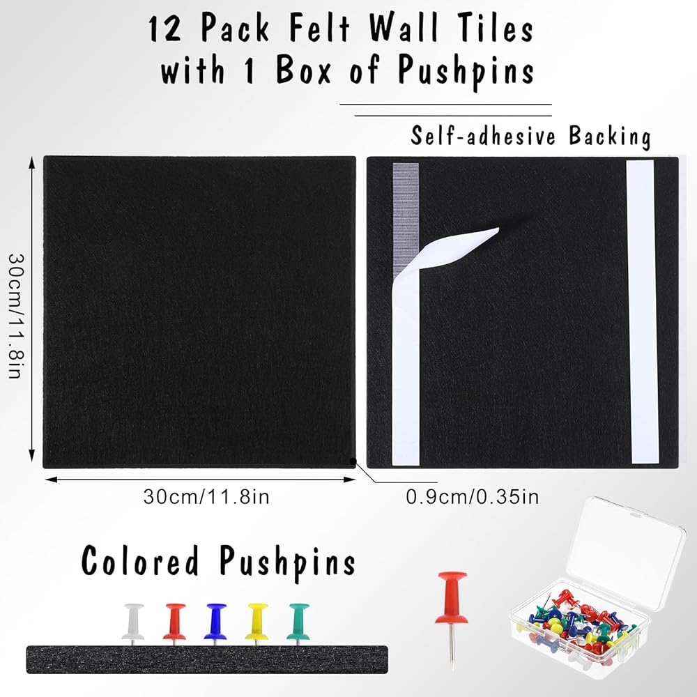 【تتضمن العبوة】سوف تحصل على 12 قطعة من بلاط الحائط اللباد وصندوق واحد من مسامير إبهام ملونة (حوالي 60 قطعة). حجم كل بلاط حائط من اللباد هو 11.8 × 11.8 بوصة والسمك حوالي 0.35 بوصة. يمكنك ربطها بالشكل والحجم المرغوب فيه وفقًا لاحتياجاتك، مثل 48 بوصة × 36 بوصة، 72 بوصة × 48 بوصة، 96 بوصة × 48 "إلخ.