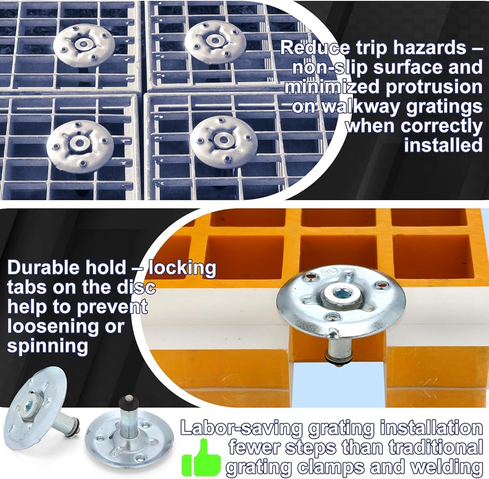 Whether you are looking to fasten steel grating or fiber-reinforced plastic (FRP) grating, this kit gets the job done. It's suitable for a myriad of applications, be it in power plants, sports halls, warehouses, shipyards, or smaller projects like bridges, stairs, and ventilation openings.