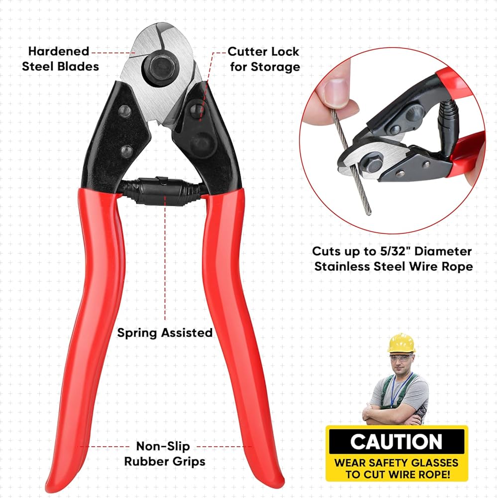 [يتضمن قاطع الأسلاك] يتم تضمين كابل من الفولاذ المقاوم للصدأ وقاطع حبل الأسلاك في العبوة. يمكنها قطع حبل كابل سلكي يصل قطره إلى 1/8 بوصة