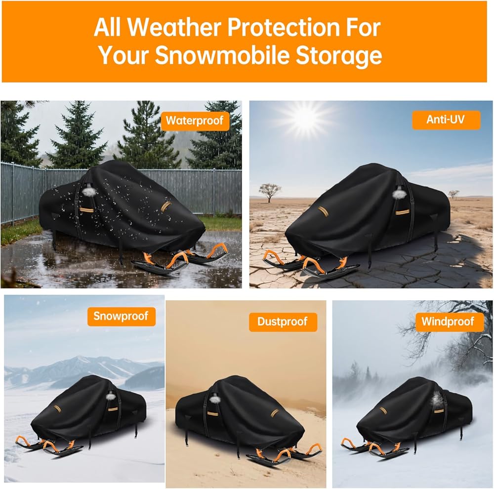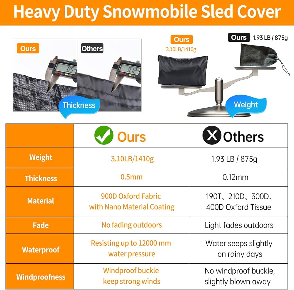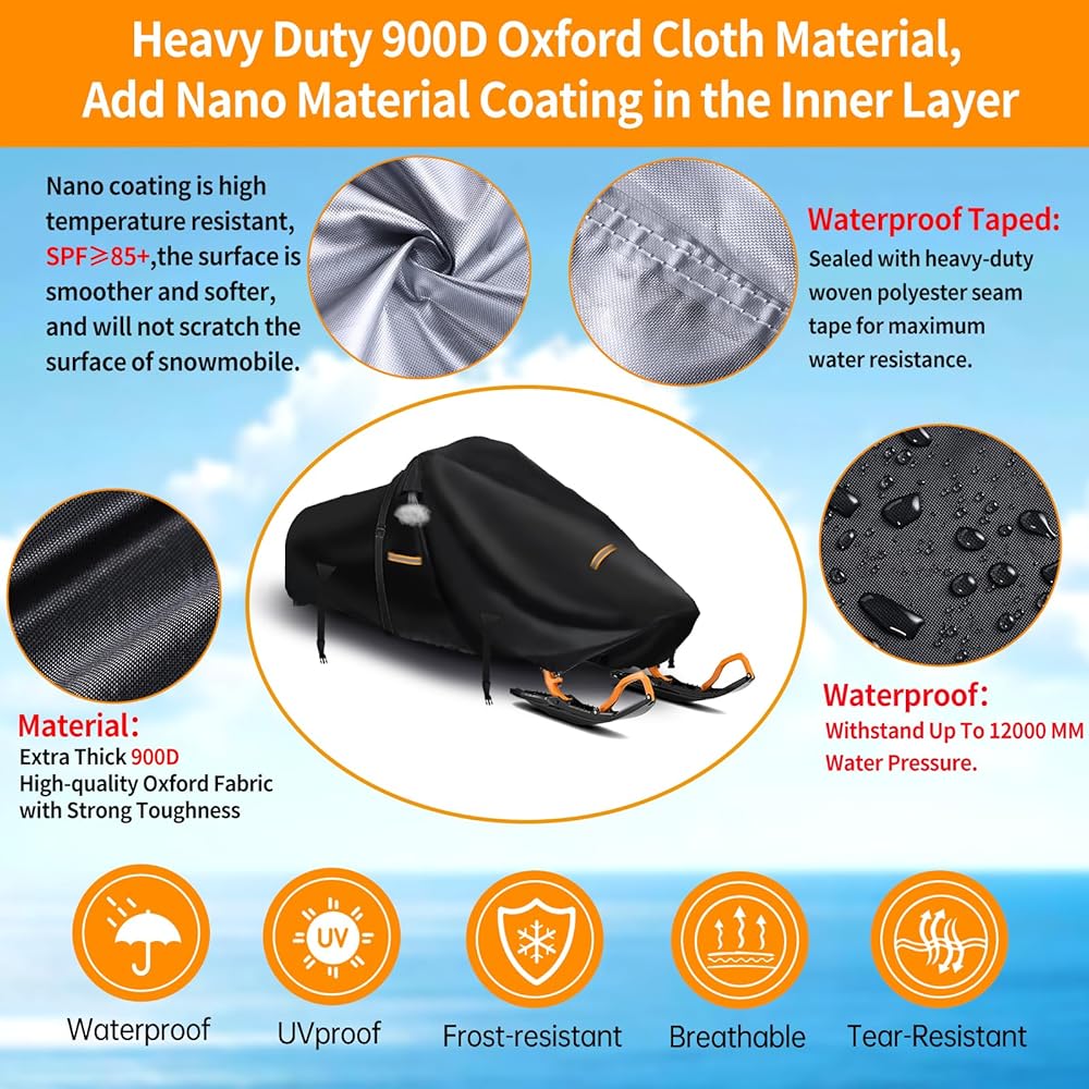 غطاء متين لمركبات الثلج مقاوم للماء في الهواء الطلق: غطاء متحرك للثلج مصنوع من نسيج أكسفورد 420D سميك للغاية مع 6 طبقات من طلاء مادة النانو بالداخل، لذا فإن الطبقة الداخلية ناعمة للغاية ومرنة. لن تخدش عربات الثلوج الخاصة بك. مضادة للأشعة فوق البنفسجية : مقاوم للأشعة فوق البنفسجية (SPF) يصل إلى 85+. عملية خياطة بإبرة مزدوجة عند المفاصل، مع إضافة شرائط مقاومة للماء، قادرة على مقاومة ضغط الماء حتى 12000 ملم. أفضل في مقاومة المسيل للدموع ومقاومة الأشعة فوق البنفسجية.