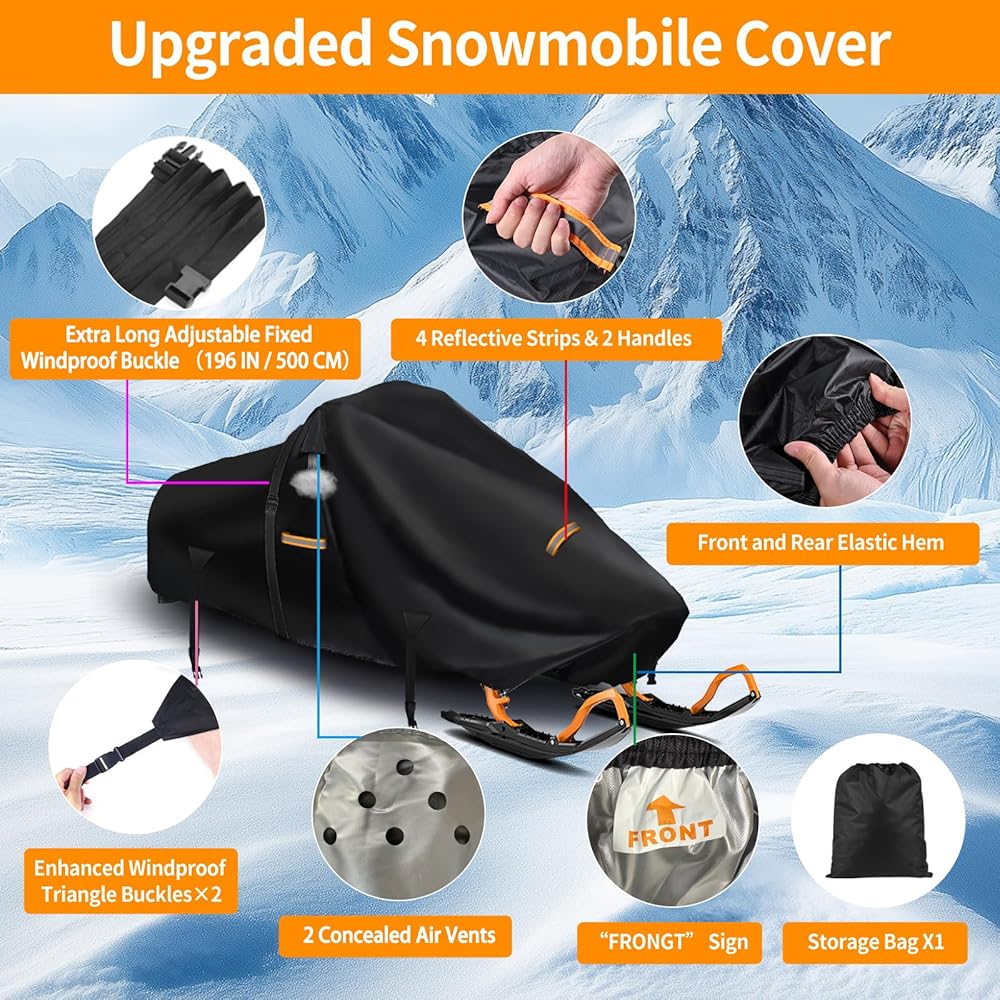 4 تفاصيل الترقية: ①إبزيم طويل جدًا مقاوم للرياح (196 بوصة / 500 سم)، يمكن لأغطية زلاجات الثلوج أن تتحمل الرياح القوية أثناء النقل. ②فتحات تهوية على كلا الجانبين: حافظ على دوران الهواء في أغطية عربات الثلوج والمقعد جافًا، ومنع الصقيع. ③تصميم الحاشية المرنة الأمامية والخلفية: يتناسب الغطاء بشكل مريح مع عربة الثلج، ويعزز مقاومة الرياح لأغطية عربة الثلج. ④4 شرائط عاكسة: توفر الحماية الليلية وتمنع الاصطدامات. ⑤العلامة "الأمامية": من الأسهل تمييز الجزء الأمامي من الغطاء.