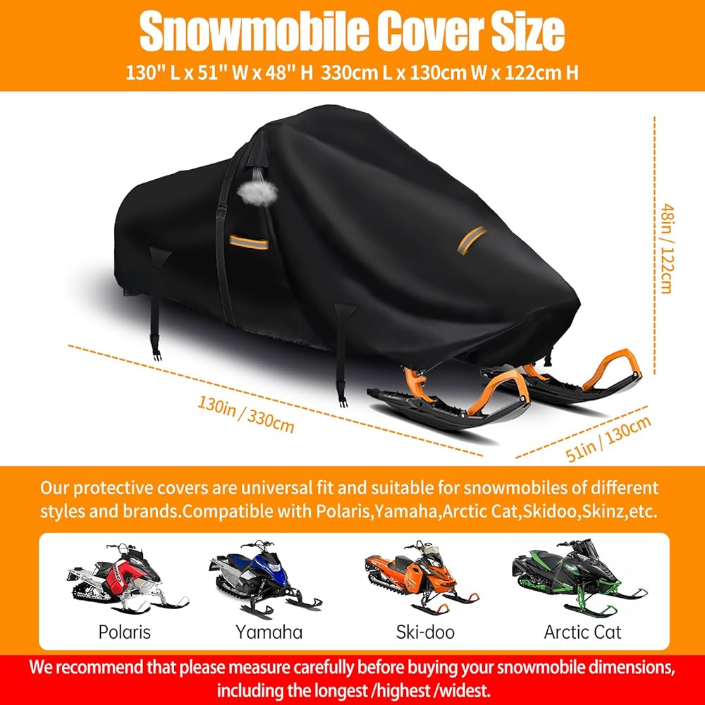 أغطية عالمية تناسب معظم عربات الثلوج: مصممة لتناسب عربات الثلوج مقاس 130 بوصة طولًا × 51 بوصة عرضًا × 48 بوصة ارتفاعًا، بما في ذلك العلامات التجارية مثل Polaris، وYamaha، وArctic Cat، وSkidoo، وSkinz، وما إلى ذلك. يرجى قياس طول مزلجة الثلج قبل الشراء. الأنف الأمامي لعربة الثلج إلى الجزء الخلفي من عربة الثلج - الزلاجات غير متضمنة.