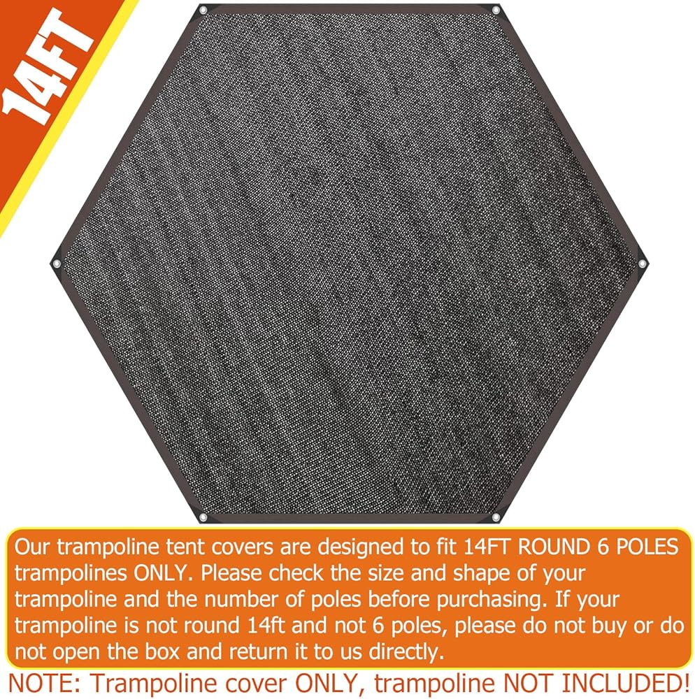 【مصممة للترامبولين الخارجي بطول 14 قدمًا 】-- تم تصميم أغطية خيمة الترامبولين الخاصة بنا لتناسب الترامبولين بطول 14 قدمًا و6 أقطاب فقط. يرجى التحقق من حجم وشكل الترامبولين الخاص بك وعدد الأعمدة قبل الشراء، فهذا مهم جدًا لأنه سيؤثر على ملاءمة الغطاء. إذا لم يكن الترامبولين الخاص بك مستديرًا بطول 14 قدمًا وليس 6 أقطاب، فيرجى عدم الشراء أو عدم فتح الصندوق وإعادته إلينا مباشرة. ملحوظة: غطاء الترامبولين فقط، الترامبولين غير متضمن!