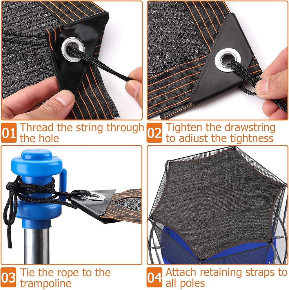 【سهلة التركيب】-- التركيب بسيط جدًا، فقط قم بربط كل زاوية من الزوايا الستة بالجزء العلوي من عمود الترامبولين بحبل ويمكنك إكمال عملية التثبيت في دقائق. نحن نقدم لك حبل طويل بما فيه الكفاية حتى تتمكن من تعديل طوله حسب الحاجة.