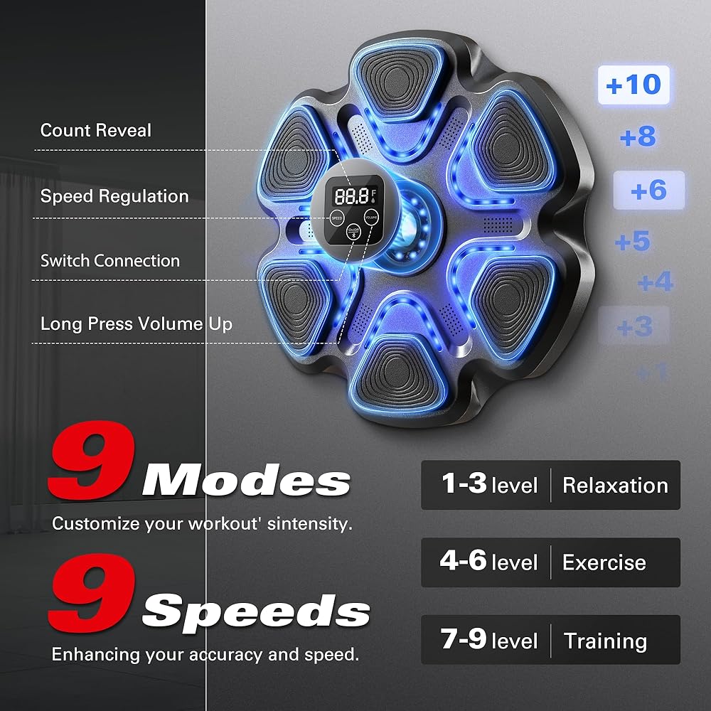• شاشة LED للحصول على تعليقات في الوقت الفعلي: ابق متحفزًا وعلى المسار الصحيح مع شاشة LED الإلكترونية المثبتة على الحائط. فهو يوفر تعليقات فورية على أدائك، بما في ذلك دقة الضربة والسرعة والإيقاع، مما يضمن حصولك على أقصى استفادة من كل جلسة.