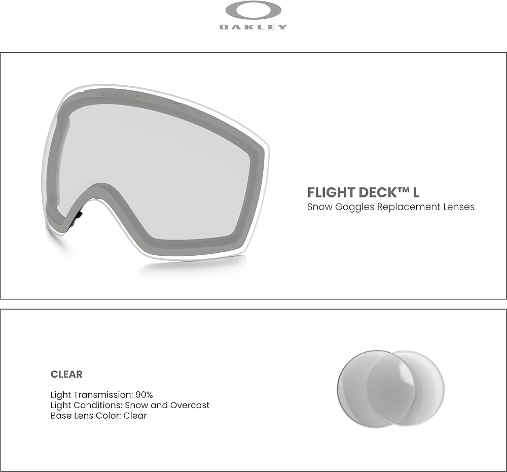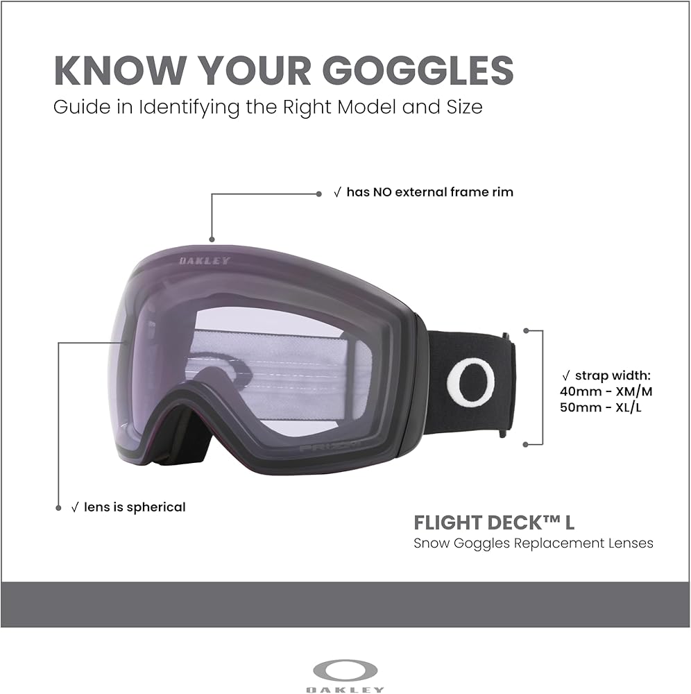 Inspired by the helmet visors of fighter pilots, the large-sized fit of Flight Deck maximizes your field of view so you won't miss a single target of opportunity. It was engineered for seamless compatibility, giving you the flexibility to choose the helmet that fits your style. Designed with Oakley's Ridgelock Technology, changing lenses is quick and easy while still allowing for a complete lens seal to prevent harsh conditions from penetrating into your goggle.