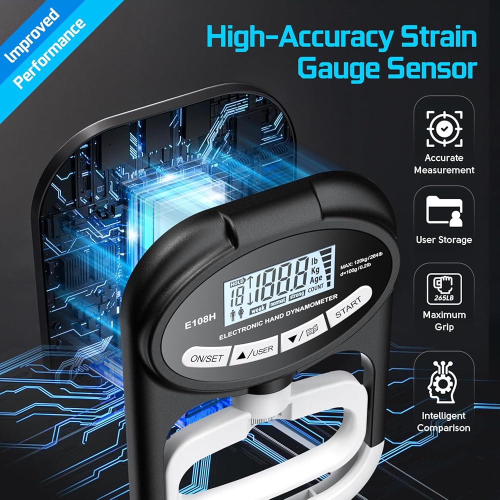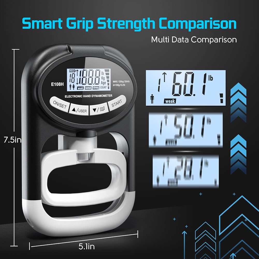 𝐆𝐫𝐢𝐩 𝐒𝐭𝐫𝐞𝐧𝐠𝐭𝐡 𝐓𝐫𝐚𝐢𝐧𝐞𝐫 𝐌𝐞𝐚𝐬𝐮𝐫𝐞𝐦𝐞𝐧𝐭: اختبار قوة القبضة يصل إلى 265 رطلاً (120 كجم) بزيادات 0.2 رطل (0.1 كجم). يوفر مدرب القبضة قراءات في الوقت الفعلي تساعدك على مراقبة مكاسب قوتك بفعالية