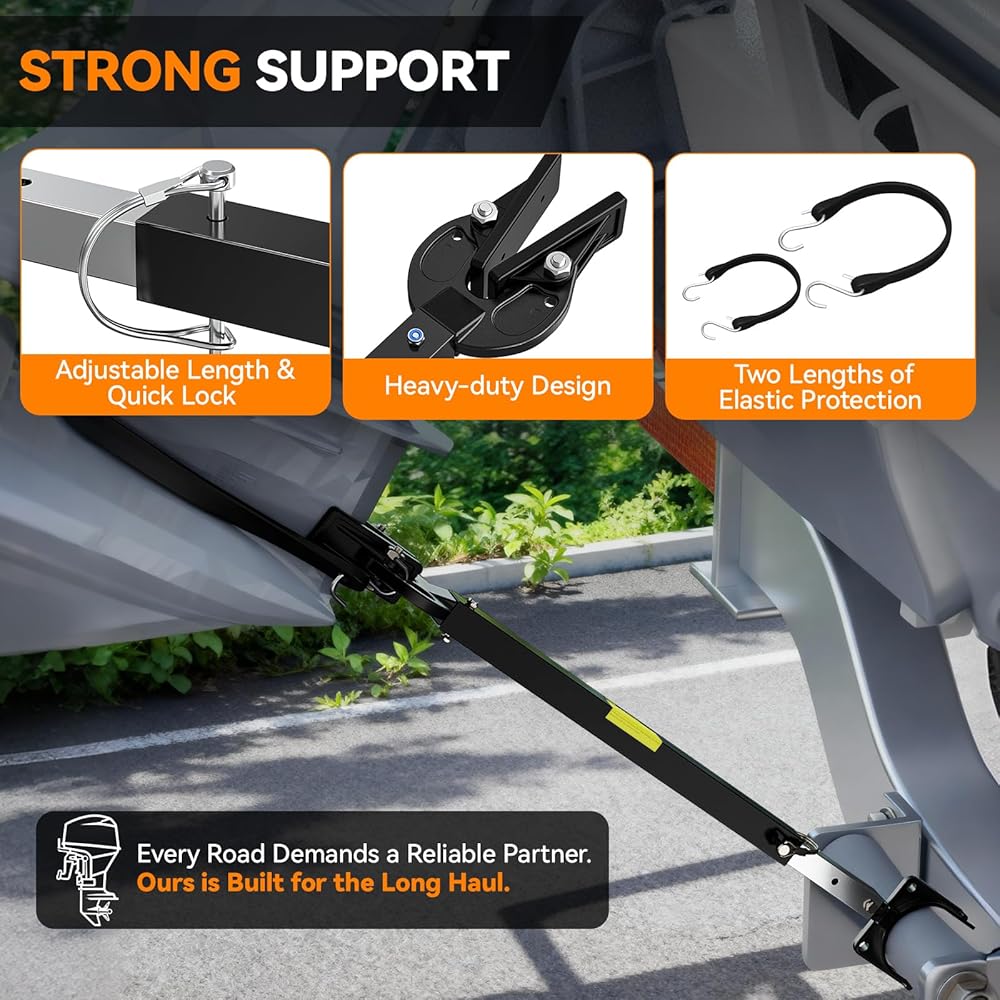 موفر الرافعة المبتكر: يدعم موفر الرافعة المؤخرة ويحميها أثناء النقل أو التخزين، مما يقلل من الضغط والأضرار المحتملة الناجمة عن وزن المحرك الخارجي. تتضمن العبوة عمودًا رئيسيًا مع دعامة مركبة، وعمود تلسكوبي مع دعامة دوارة، ودعامة تثبيت للمقطورة، و2 مسمار، و2 صامولة بلوط، وسلسلة مطاطية مقاس 15 بوصة و23 بوصة.