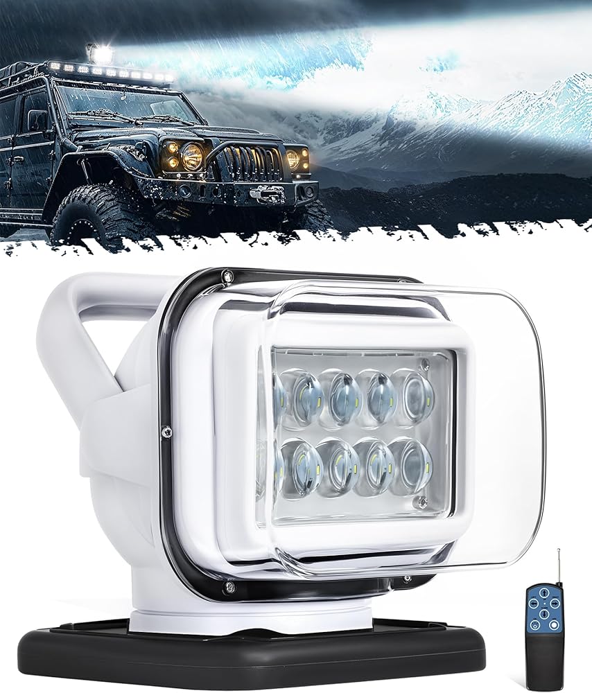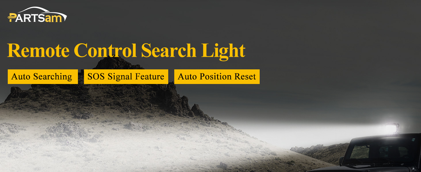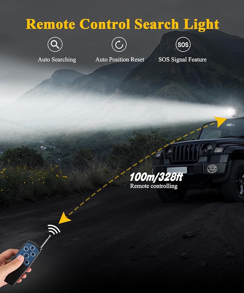 أضواء البحث بالتحكم عن بعد: ميزة البحث التلقائي، وإعادة ضبط الموضع تلقائيًا (يعود إلى الوضع الأصلي عند إيقاف التشغيل)، وميزة إشارة SOS. تتضمن العبوة جهاز تحكم عن بعد يمكنه التحكم في المحرك لتوجيه شعاع الضوء إلى أي مكان تريده، مسافة تحكم عن بعد تصل إلى 100 متر/328 قدم