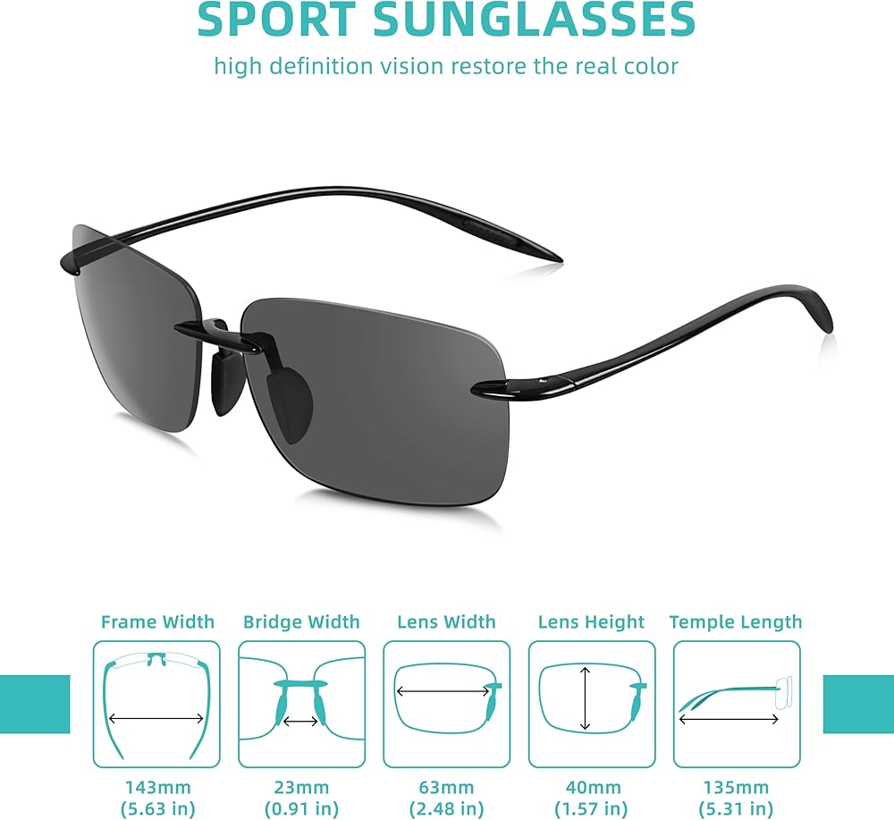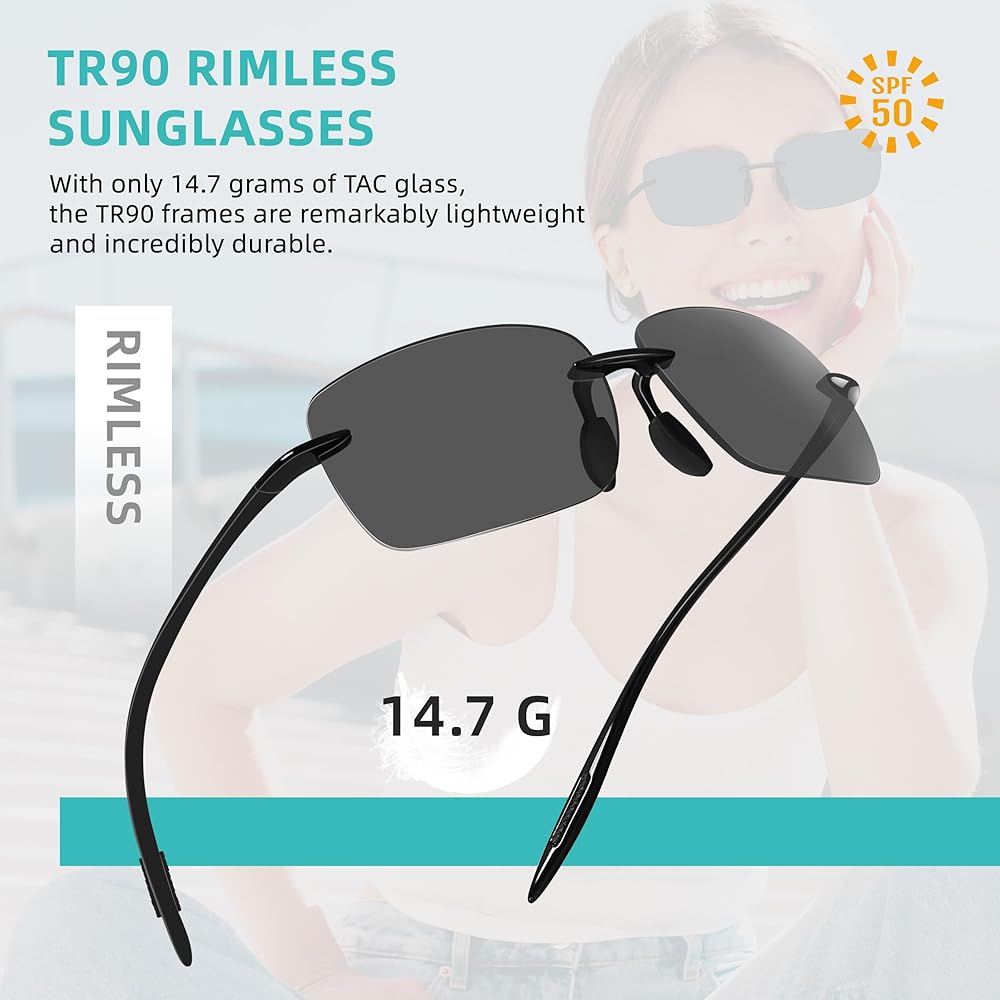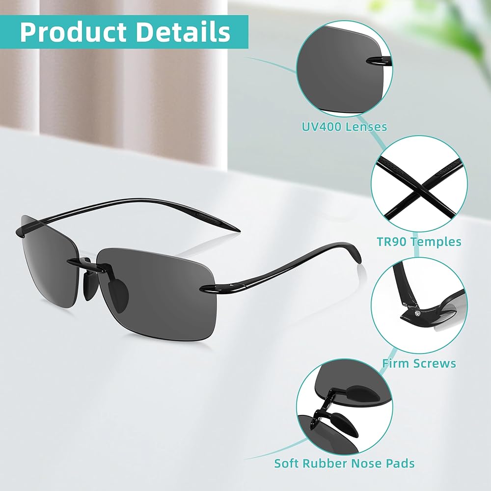 هيكل متين وخفيف الوزن: مصنوعة من TR90، وهو بوليمر خفيف الوزن ومتين، هذه النظارات الشمسية الرجالية بدون إطار تتميز بأنها مقاومة للصدمات والخدش وغير قابلة للكسر. يوفر التصميم بدون إطار رؤية واضحة دون عائق، بينما يضمن الإطار خفيف الوزن الراحة للاستخدام لفترة طويلة دون التسبب في عدم الراحة أو الضغط.