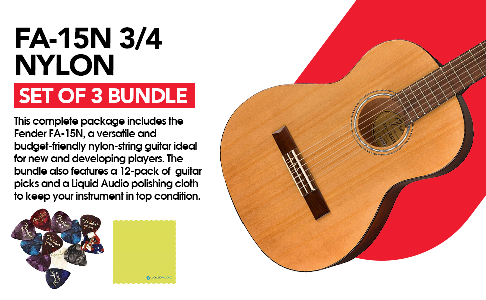 يشمل: Fender FA-15N 3/4 نايلون جيتار صوتي، لوحة أصابع من خشب الجوز، طبيعي - 0971160121، 12 قطعة جيتار وقطعة قماش سائلة لتلميع الصوت.