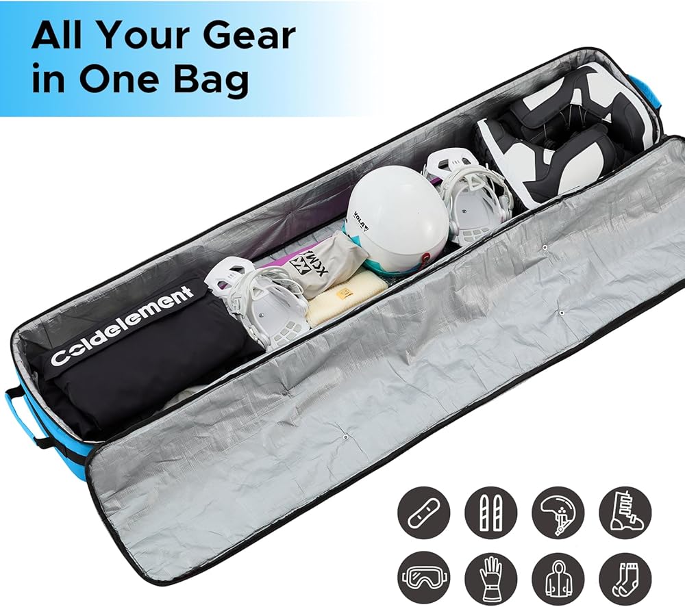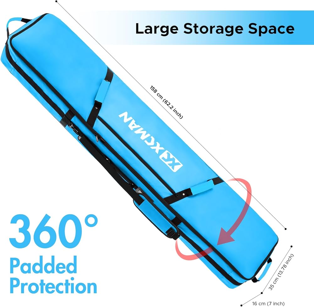LARGE CAPACITY:This padded snowboard bag is offered in 2 lengths(158cm/62 inches and 165cm/65 inches). Both are 35cm/14 inches wide and 16cm/6 inches tall ,a large organizing main compartment with reinforced straps . This snowboard bag holds 2 skis/bindings, 2 pairs of boots, poles, helmet, gloves, jacket, pants, goggles, and tuning kit.