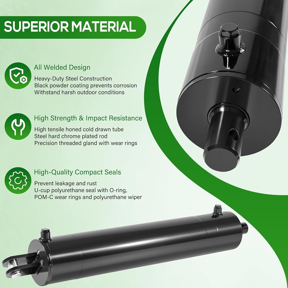 • 【Superior Material】Heavy-Duty Steel Construction with welded design and finished with black powder coating protects against corrosion. It has a high tensile honed cold drawn tube, steel hard chrome plated rod, precision threaded gland with wear rings, high strength and impact resistance. With compact seals, U-cup polyurethane seal with O-ring, POM-C wear rings and polyurethane wiper to prevent leakage and rust.