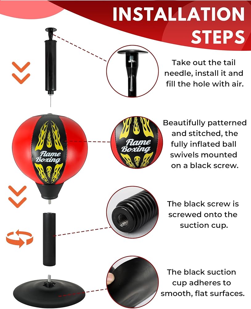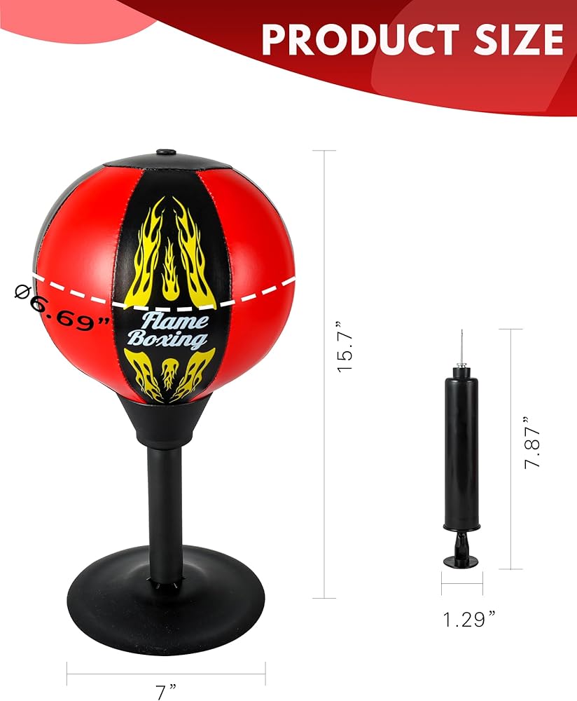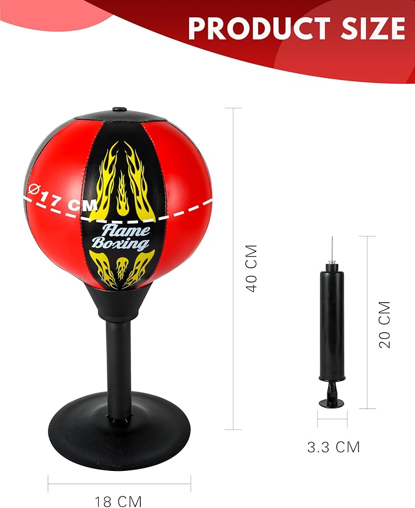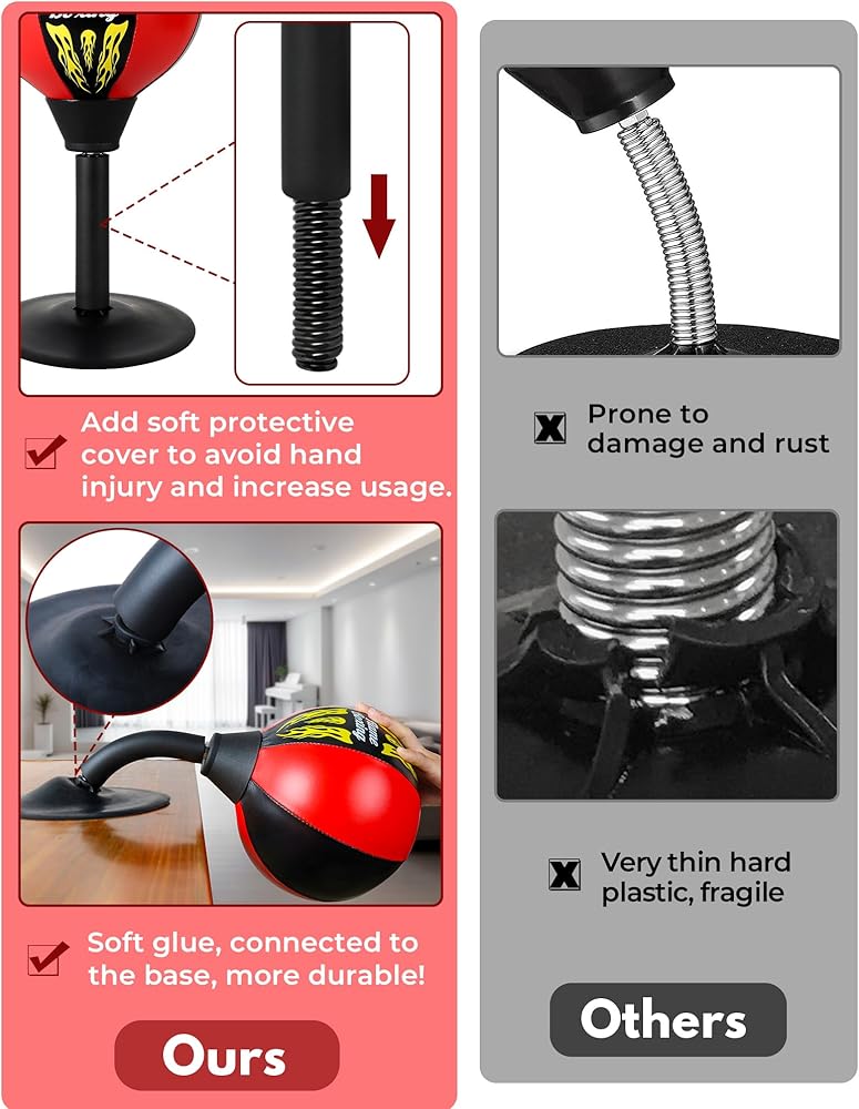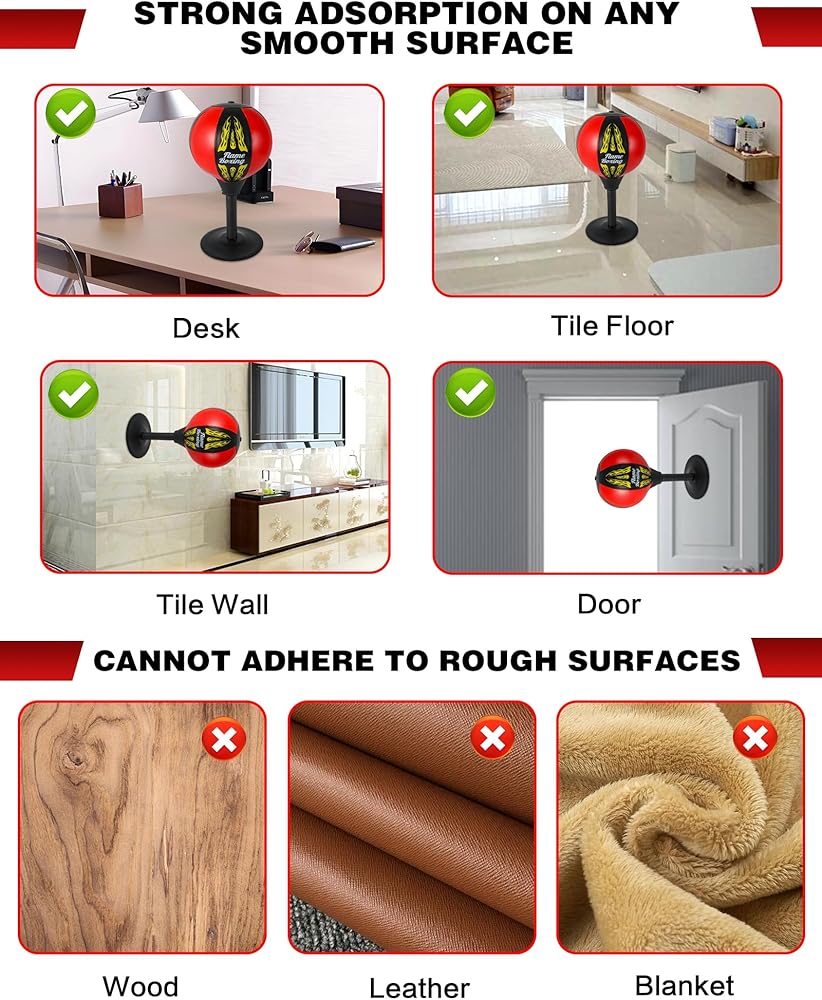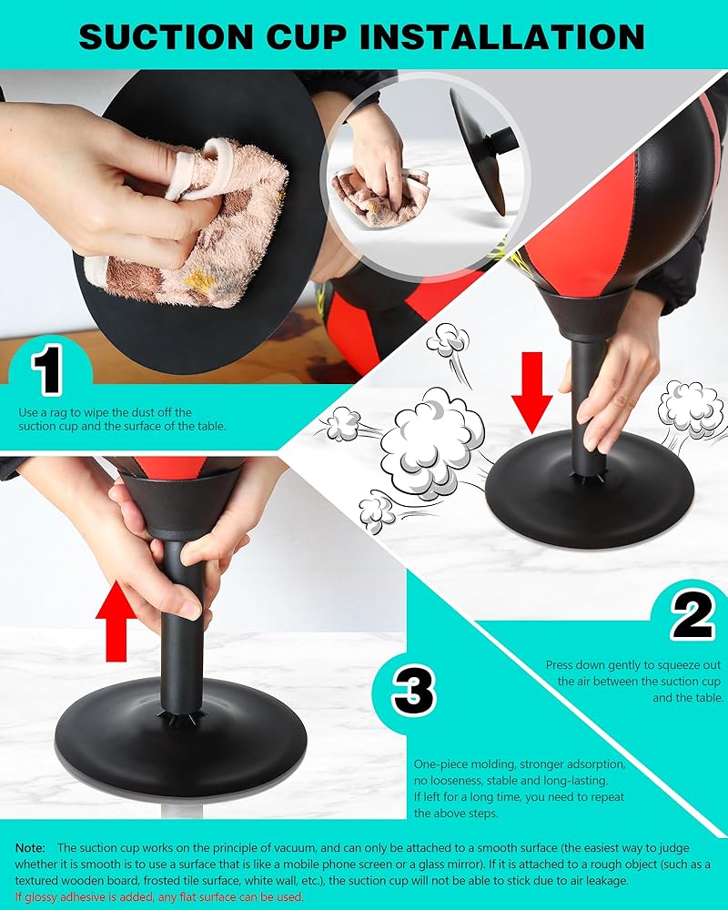 قبضة شفط قوية: تلتصق بأمان على أي سطح مستو، مما يضمن الثبات حتى أثناء اللكمات الشديدة. توفر حقيبة اللكم المكتبية هذه قبضة قوية، مما يجعلها مثالية لكل من المرح المكتبي ومعدات الصالة الرياضية المنزلية. مثالي لأولئك الذين يريدون منفذًا لتخفيف التوتر أثناء العمل أو ممارسة الرياضة.