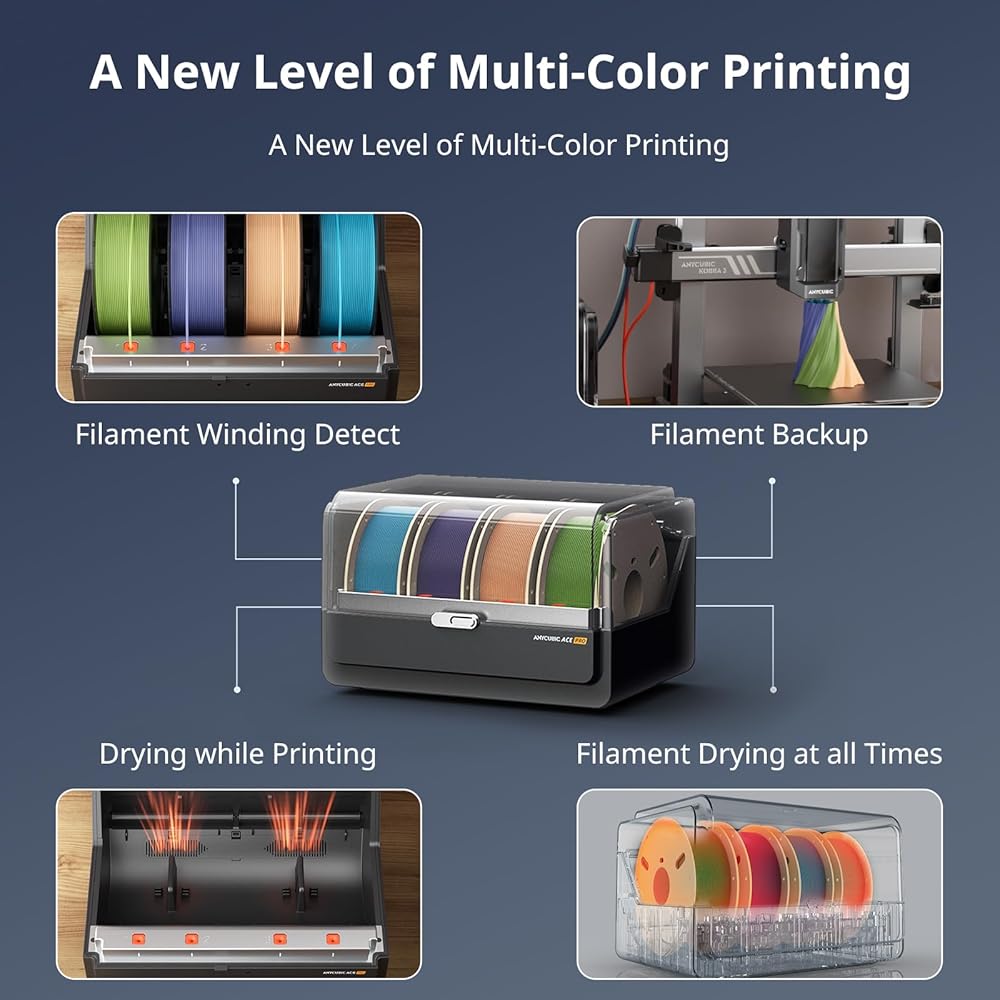 【محرك ذكي، أداء ثوري】يدعم Anycubic Color Engine Pro (ANYCUBIC ACE Pro) اكتشاف انسداد الفوهة وإيقاف الطباعة مؤقتًا والتنبيه على الفور. يؤدي التحميل والتفريغ التلقائي للشعيرات إلى التخلص من الفوضى أو التشابك. تحافظ الطاقة 200 واط على جفاف الخيوط في جميع الأوقات وتضمن تجفيف الخيوط أثناء الطباعة