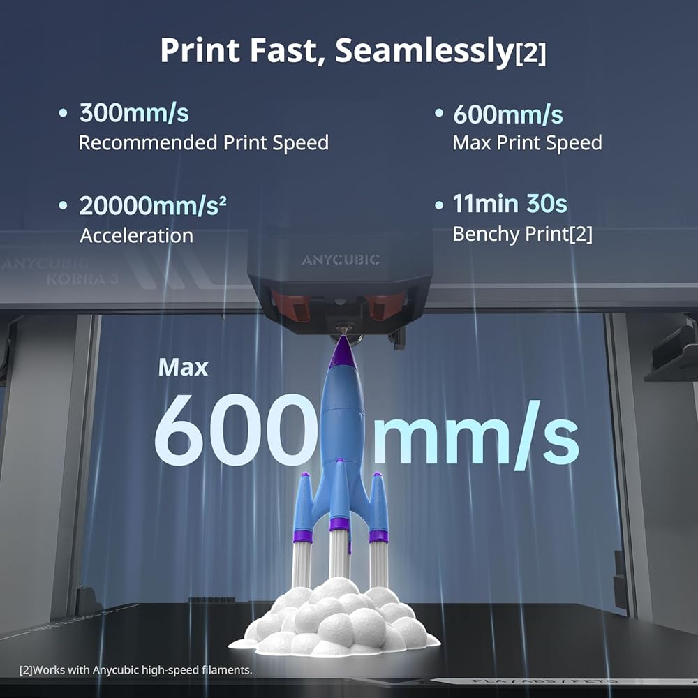 【سرعة طباعة أعلى 600 مم/ثانية】بسرعات تصل إلى 600 مم/ثانية، تضع مجموعة Anycubic Kobra 3 معيارًا للطباعة عالية السرعة. أقصى تسارع هو 20.000 مم / ثانية. السرعة الموصى بها هي 300 ملم/ثانية. استمتع بتجربة الطباعة بوتيرة التفكير ووفر وقتك الثمين