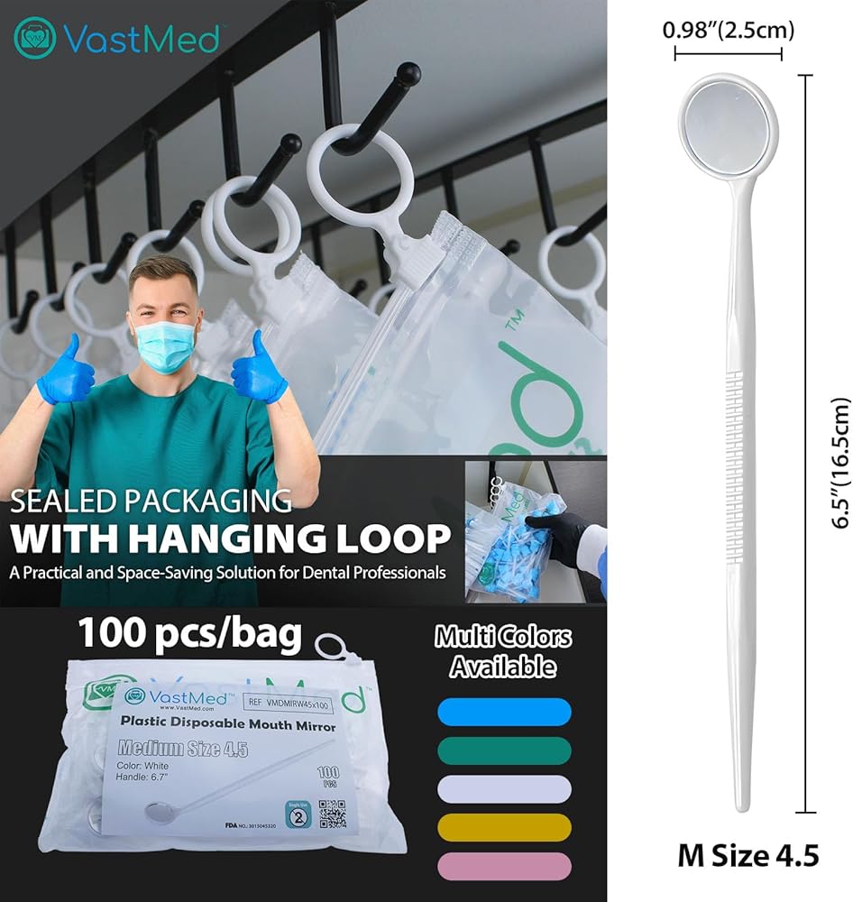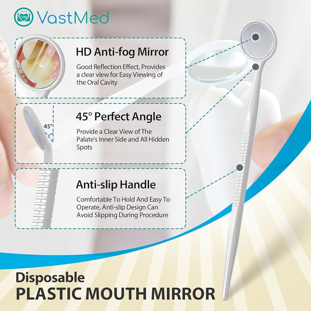 HIGH QUALITY: VASTMED disposable dental mirrors are made of high quality plastic and glass. The handle is long enough for a comfortable grip, sturdy, lightweight, and reliable. Each mouth mirror is individually packed in a plastic bag to ensure cleanliness and hygiene.
