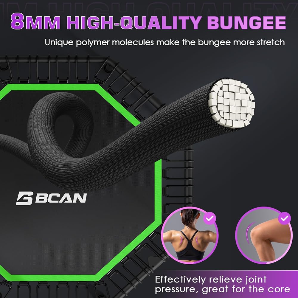 Premium Bungees: The high-quality bungees provide a smoother and quieter experience, 8 mm thickened bungees deliver a comfortable workout experience and caring protection for the knees and back. The elastic rope jumping system can reduce 90% of the noise.