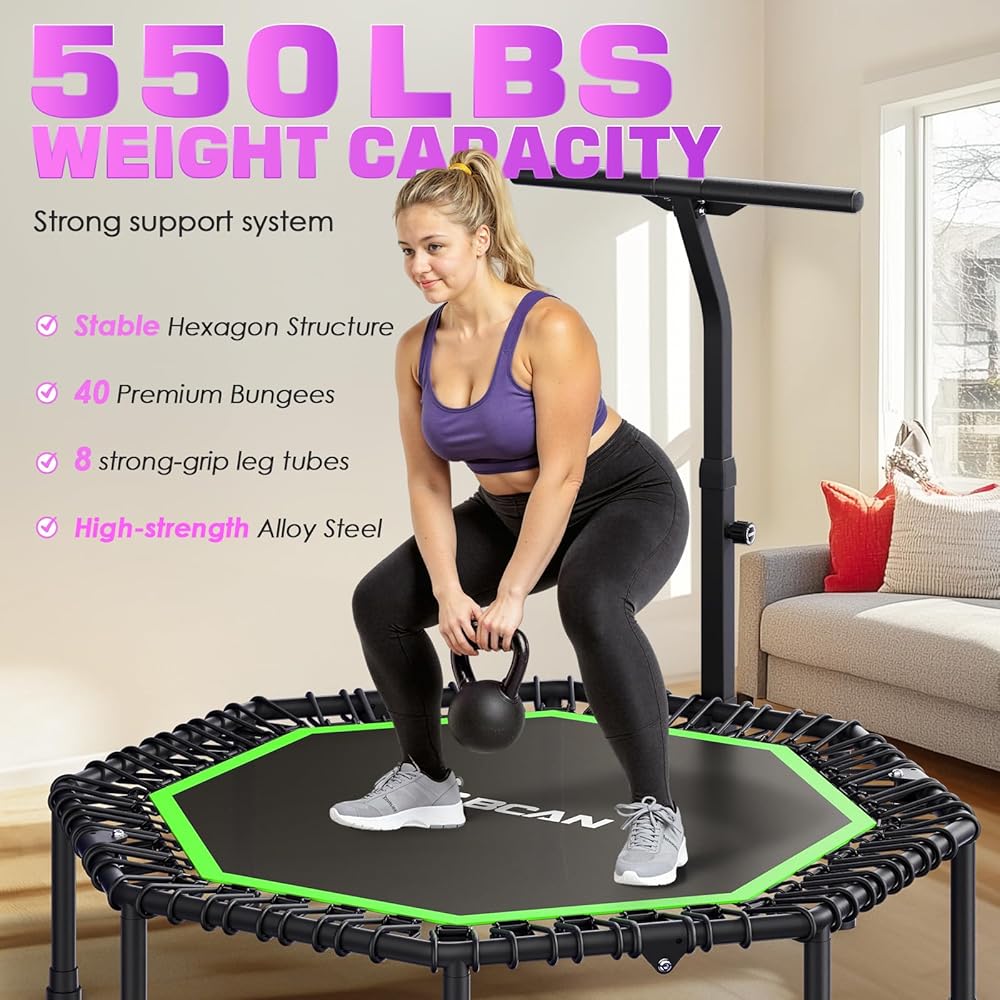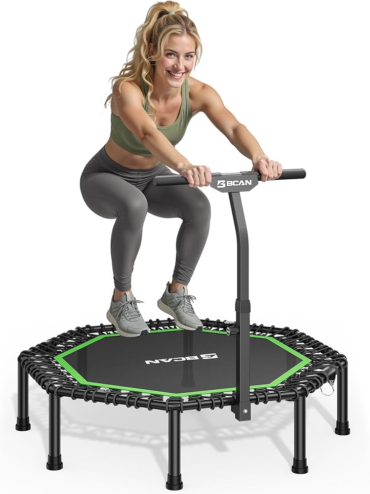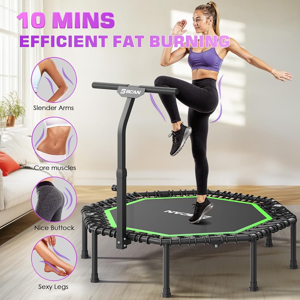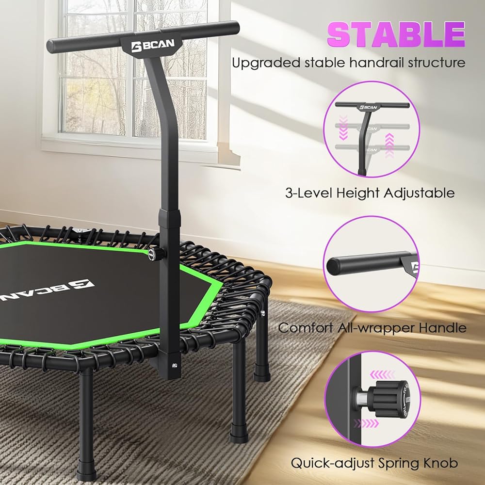 BCAN 51" Mini Foldable Trampoline, Max Load 450 LBS Fitness Trampoline with T-Adjustable Handle Bar, Silent Bungees, Larger, More Stable, Quieter Exercise Rebounder for Adults Indoor/Garden Workout