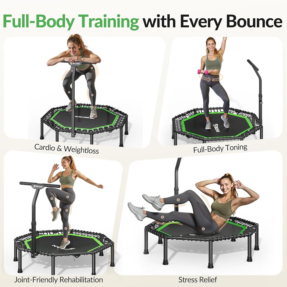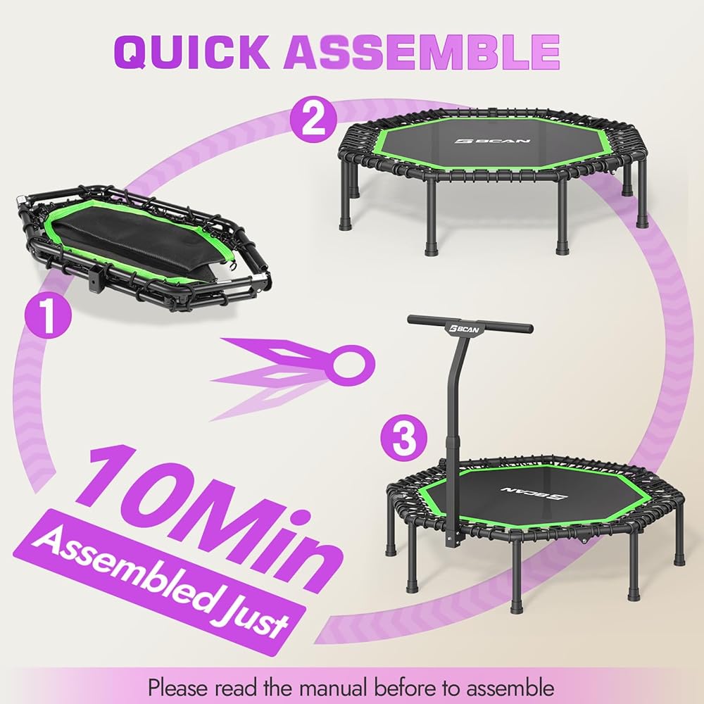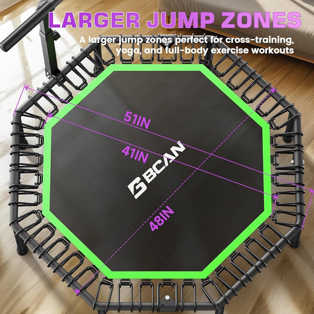 BCAN 51" Mini Foldable Trampoline, Max Load 450 LBS Fitness Trampoline with T-Adjustable Handle Bar, Silent Bungees, Larger, More Stable, Quieter Exercise Rebounder for Adults Indoor/Garden Workout