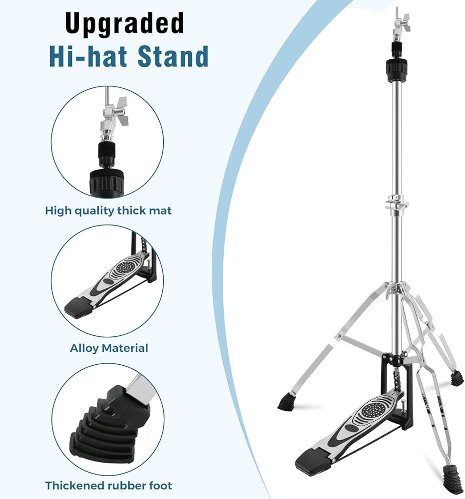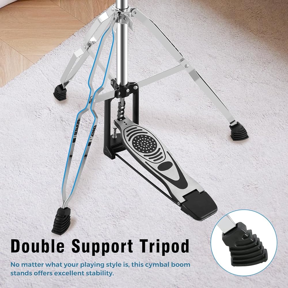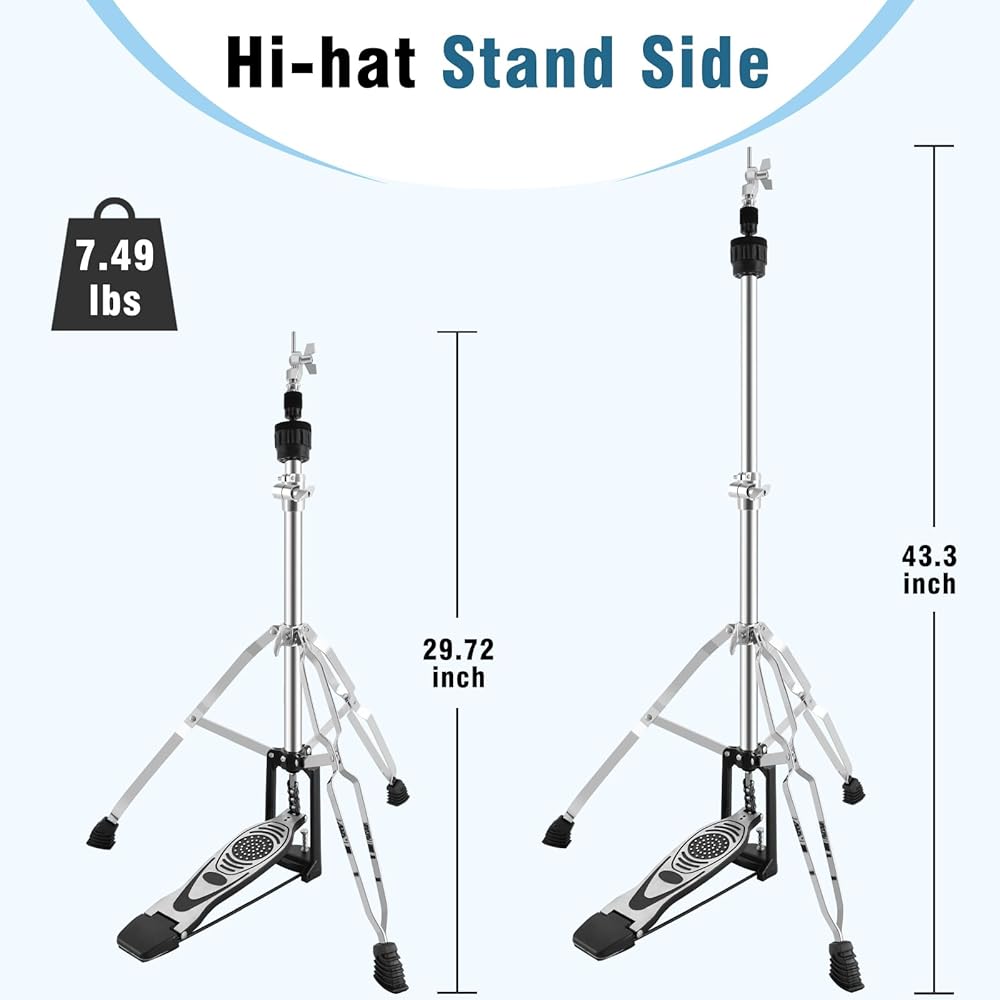 • Extreme Stability: We upgraded the stability of the hi-hat stand, the double-braced hi hat stand weighs in at a solid 7.5 pounds, offering superior stability compared to lighter models. Double-braced legs and non-slip rubber feet keep your setup steady, even during high-energy performances. Say goodbye to wobbling and shifting mid-song