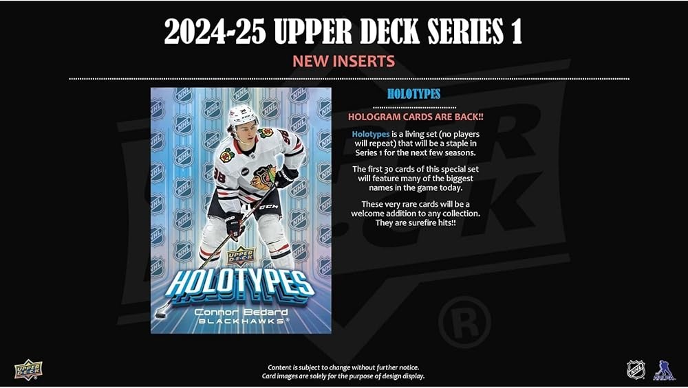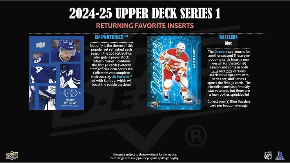 Series 1 sports the first 250 cards of the 2024-25 Upper Deck Base Set. Annually, the Upper Deck Base Set is the most widely-collected Base Set in hockey. It includes 198 veteran cards, 49 Young Guns rookie cards and three checklist cards. The iconic Young Guns are the most anticipated rookie cards of the season.