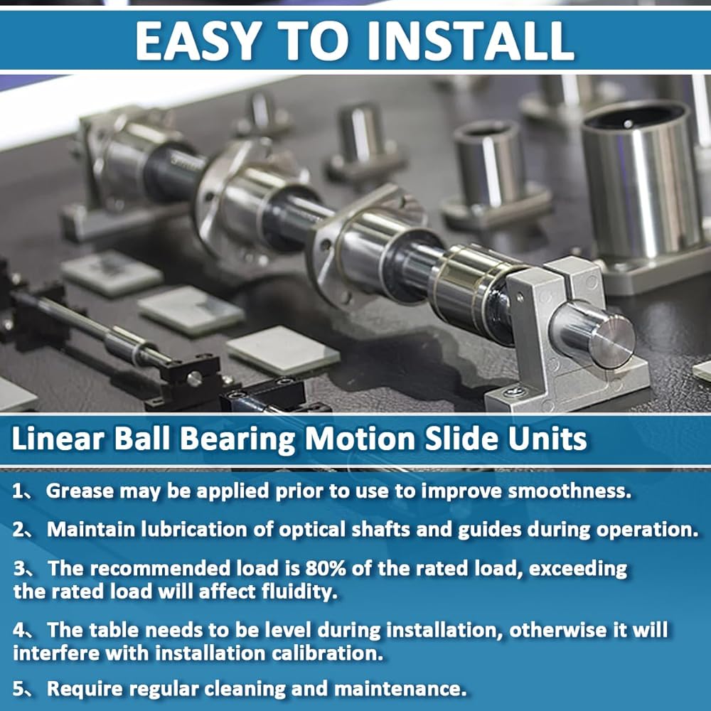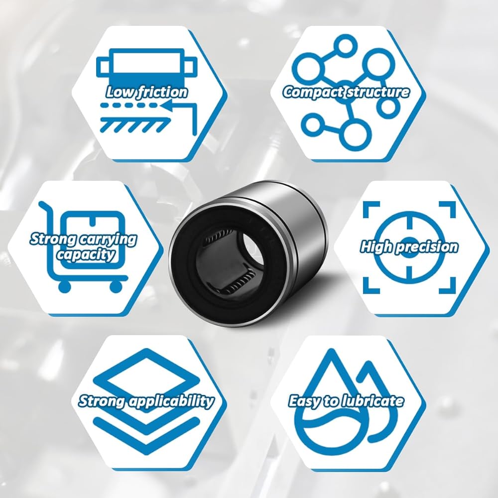 • Quality Material: The linear bearing is made of bearing steel, which has good abrasion resistance, high precision, and good strength, plated surface treatment can operate under high-temperature conditions.