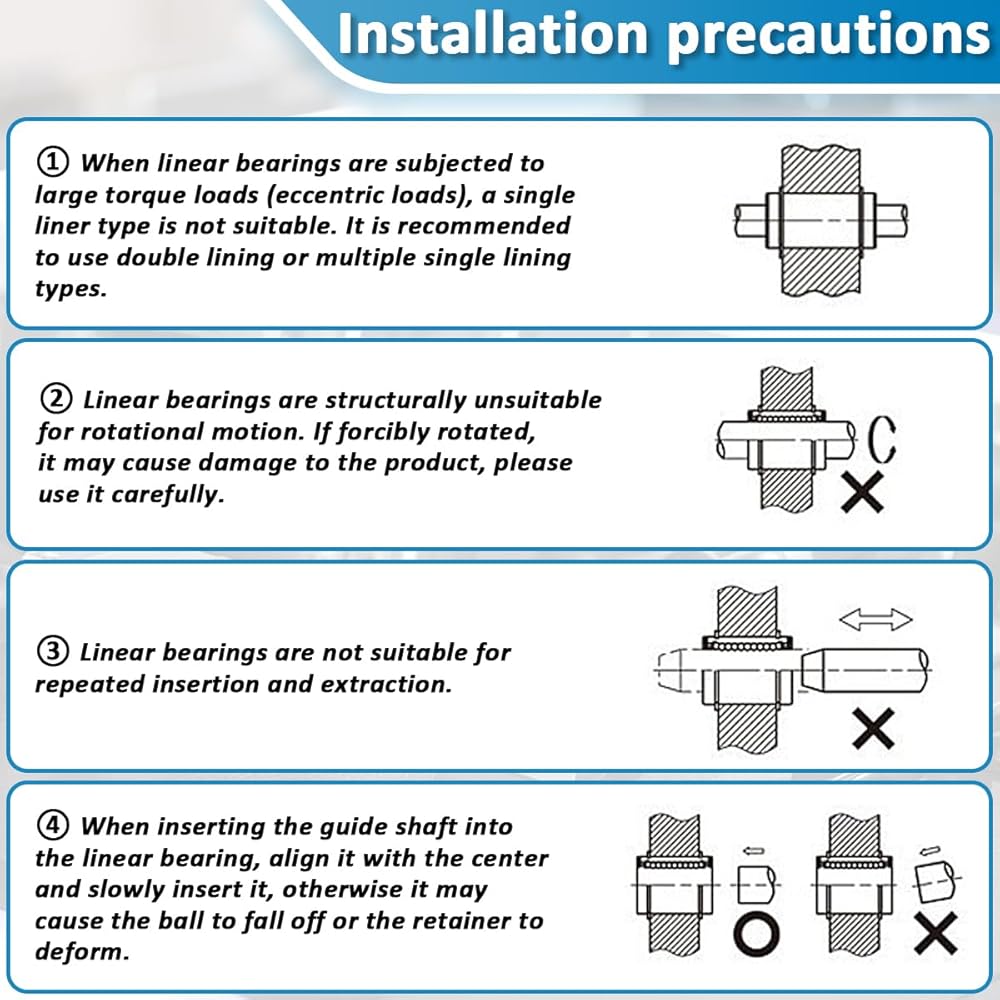 Quality Material: The linear bearing is made of bearing steel, which has good abrasion resistance, high precision, and good strength, plated surface treatment can operate under high-temperature conditions.