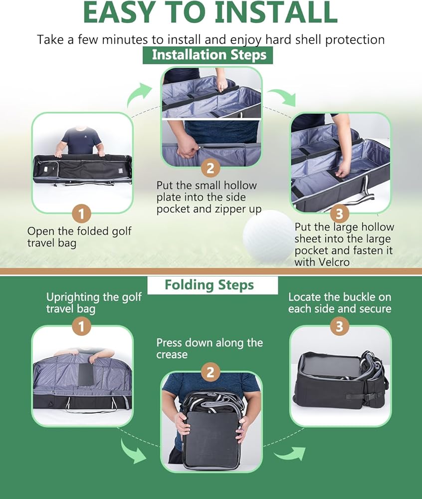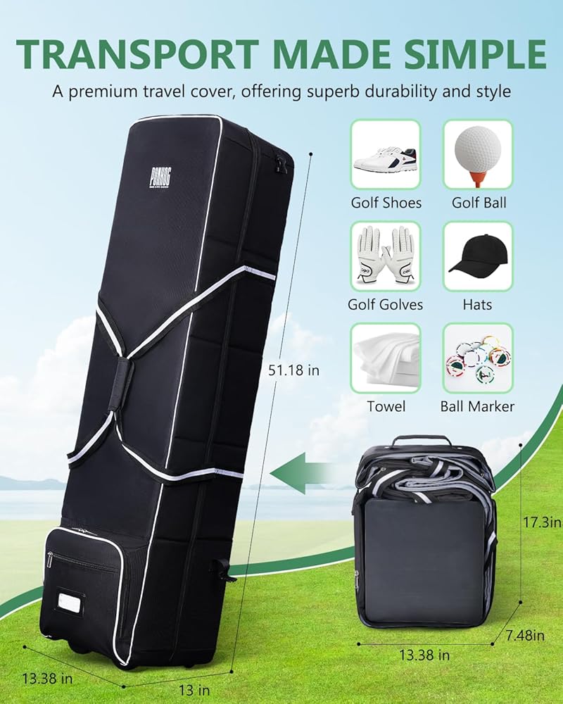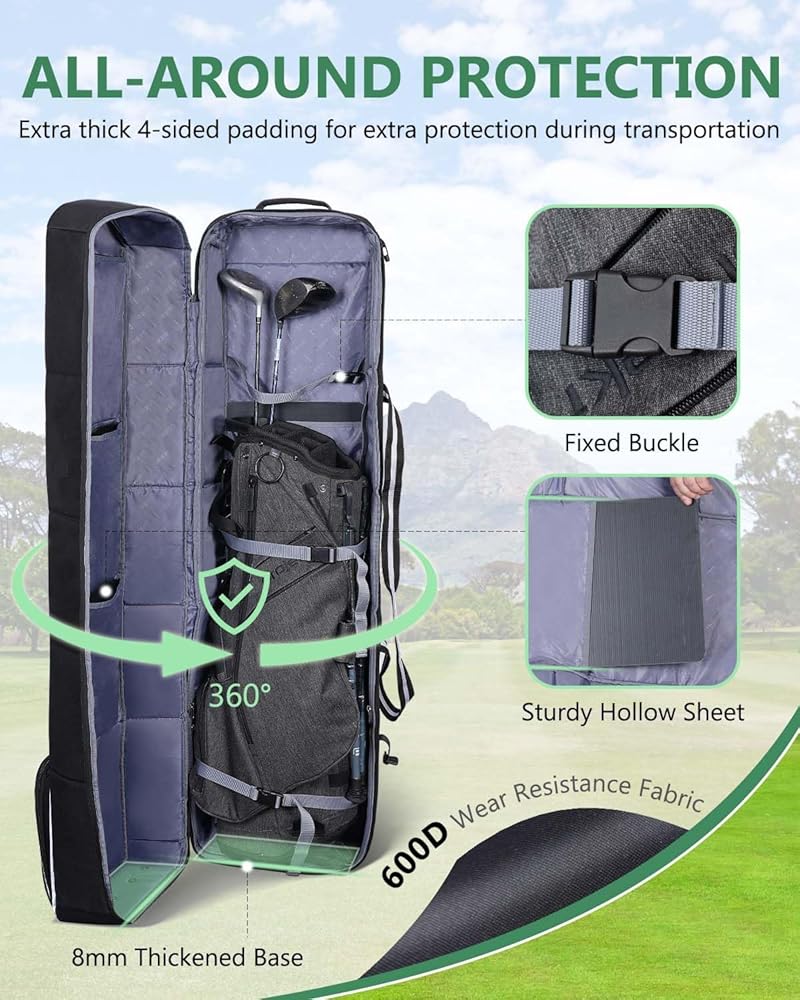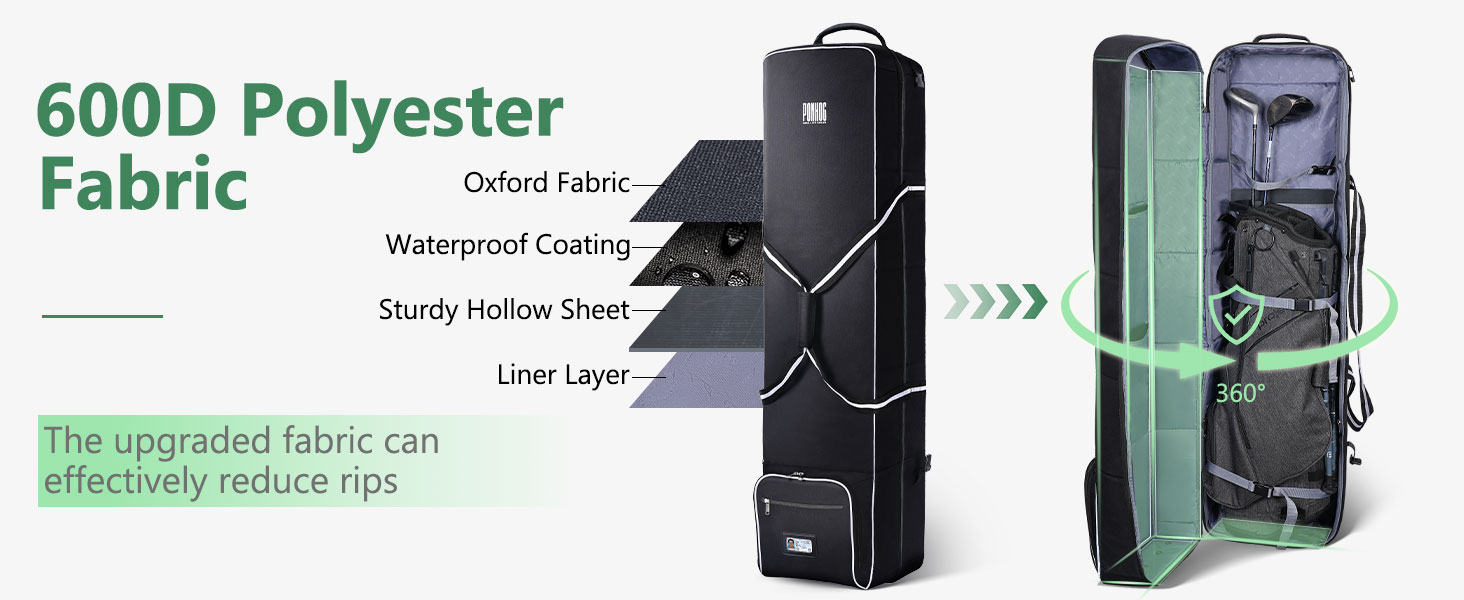 الحماية الكاملة: حقيبة سفر الجولف هذه مصنوعة من نسيج أكسفورد بوليستر عالي التحمل 600D. على عكس حقائب السفر ذات الغلاف الناعم العادي، يتم استخدام تصميم الملاءة المجوفة الصلبة لحماية مضارب الجولف الخاصة بك بشكل فعال